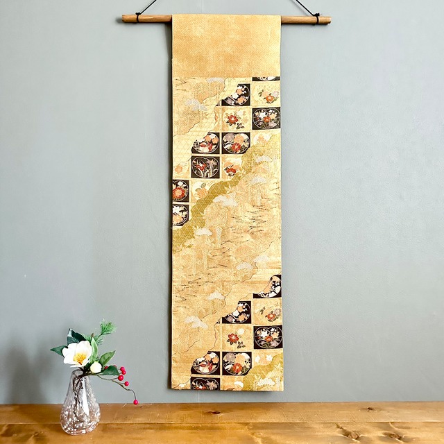 Kimono tapestry 帯のタペストリー 金色に百花繚乱 Japanese Kimono Interior Art Panel Kakejiku Art Wall Art Kimono Panel