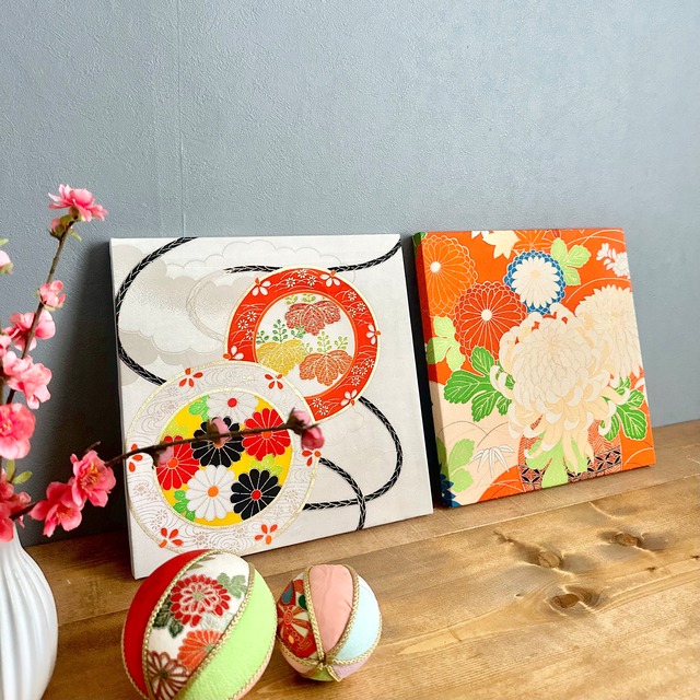 Kimono fabric panel 30×30cm 着物のファブリックパネル ハレノヒ 鼓と菊花(2枚組) Japanese Kimono Interior Japanese Style Art Panels Kimono panel Washitsu Japanese interior