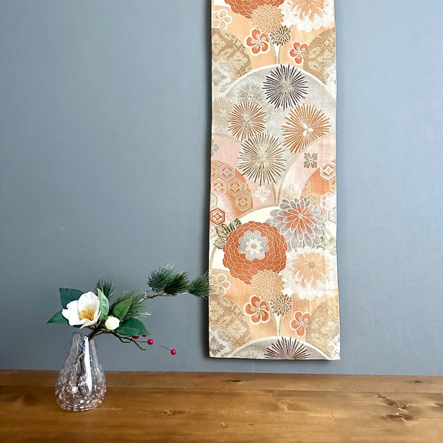 Kimono tapestry 帯のタペストリー 菊の扇の青海波 Japanese Kimono Interior Art Panel Kakejiku Art Wall Art Kimono Panel