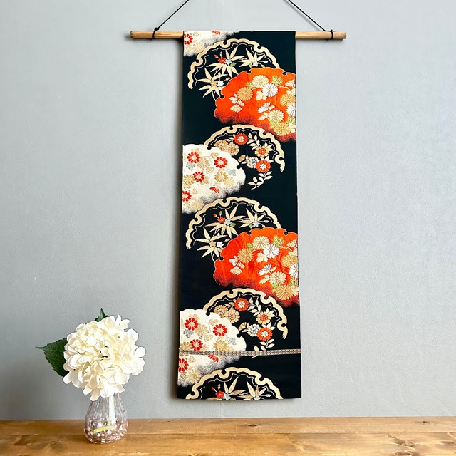 美しい漆黒の帯。 朱色や白で描かれた菊花などが美しい雪輪の素敵な帯からお作りしたタペストリーです。 菊は日本の国花。 大変高貴な吉祥文様で、不老長寿への願いが込められています。 どの季節にも愛される、とても人気の高い柄です。 雪輪文様は、豊かな雪が豊かな春の水の恵みをもたらすことから、豊作や豊かさを表す吉祥文様です。 すぐに飾っていただけるよう、タペストリーと棒、黒の紐のセットとなっております。 本物の帯を使った、他にはないタペストリーですので、普段使いはもちろん、お正月やひなまつりなどの,ハレの日のインテリアとして、母の日や父の日、敬老の日、誕生日や記念日のギフトとして、また、海外の方への日本のお土産としても最適です。 梱包は、丁寧に包んでお送りいたしますので、そのままギフトとしてもご利用いただけます。 また、メッセージカード等のご希望がございましたら。喜んで対応させていただきます。 サイズ(Size) 100cm × 60cm (タペストリーの棒が60センチ、帯の幅は約30センチとなっております。)(The tapestry bar is 60cm and the width of the Kimono is approximately 30 cm.) 再度のご購入で、棒が不要な方は、800円引きにてご案内させていただけますので、お知らせくださいませ。 ご質問等ございましたら、お気軽にお問合せくださいませ。 This tapestry is made from upcycled real Japanese Kimono. It is a one-of-a-kind interior that captures the traditional beauty of Japan. Perfect for everyday use, as well as for interior decorations Good as a souvenir of Japan. We hope you may enjoy" The beauty of Kimono " and you may feel" The joy of taking care of things ". Please feel free to contact us with any questions. ※ご購入前に、「SHOPPING GUIDE」をご一読ください ※Please read "SHOPPING GUIDE" before purchasing. #着物 #タペストリー #アンティーク着物 #和モダン #インテリア #着物パネル #壁掛け #和雑貨 #着物リメイク #和のインテリア #古裂 #こぎれ #帯 #壁飾り #サスティナブル #結婚祝い #新年 #新生活 #和 #壁 #正月 #SDGs #サスティナブル #アップサイクル #和カフェ #和室 #掛け軸 #敬老の日 #正月飾り #和のインテリア #ハレの日 #縁起もの #日本のお土産 #世界に一つだけのインテリア #世界に一つだけのギフト #古民家 #古民家インテリア #古民家再生 #ひなまつり #ひな祭り #七五三 #テーブルマット #プレイスマット #敷物 #テーブルランナー #テーブルウェア #kimono #MadeInJapan #Japaneseart #Kimonofabric #artpanels #Japanesestyleinterior #japaneseroom #washitsu #kakejikuart #kakejiku #tokonoma #Japanesekimonopanel #WashitsuArt #Washitsu #Japanesesuvenior #antiquekimono #Kimonointerior #Japanese-styleroom #JapaneseKimono #KimonoPanel