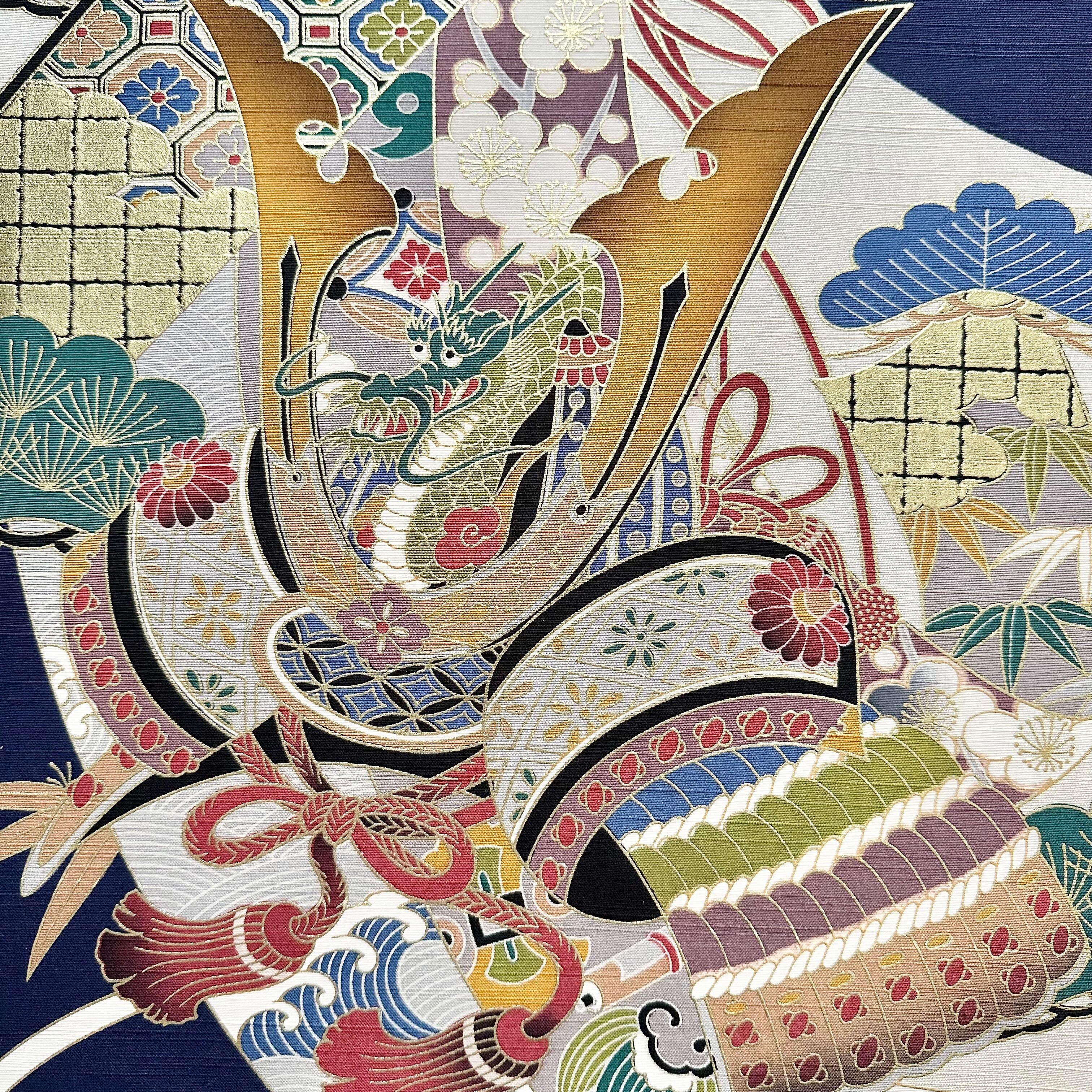 深い紺色の子どもの晴れ着からお作りしたファブリックパネル。