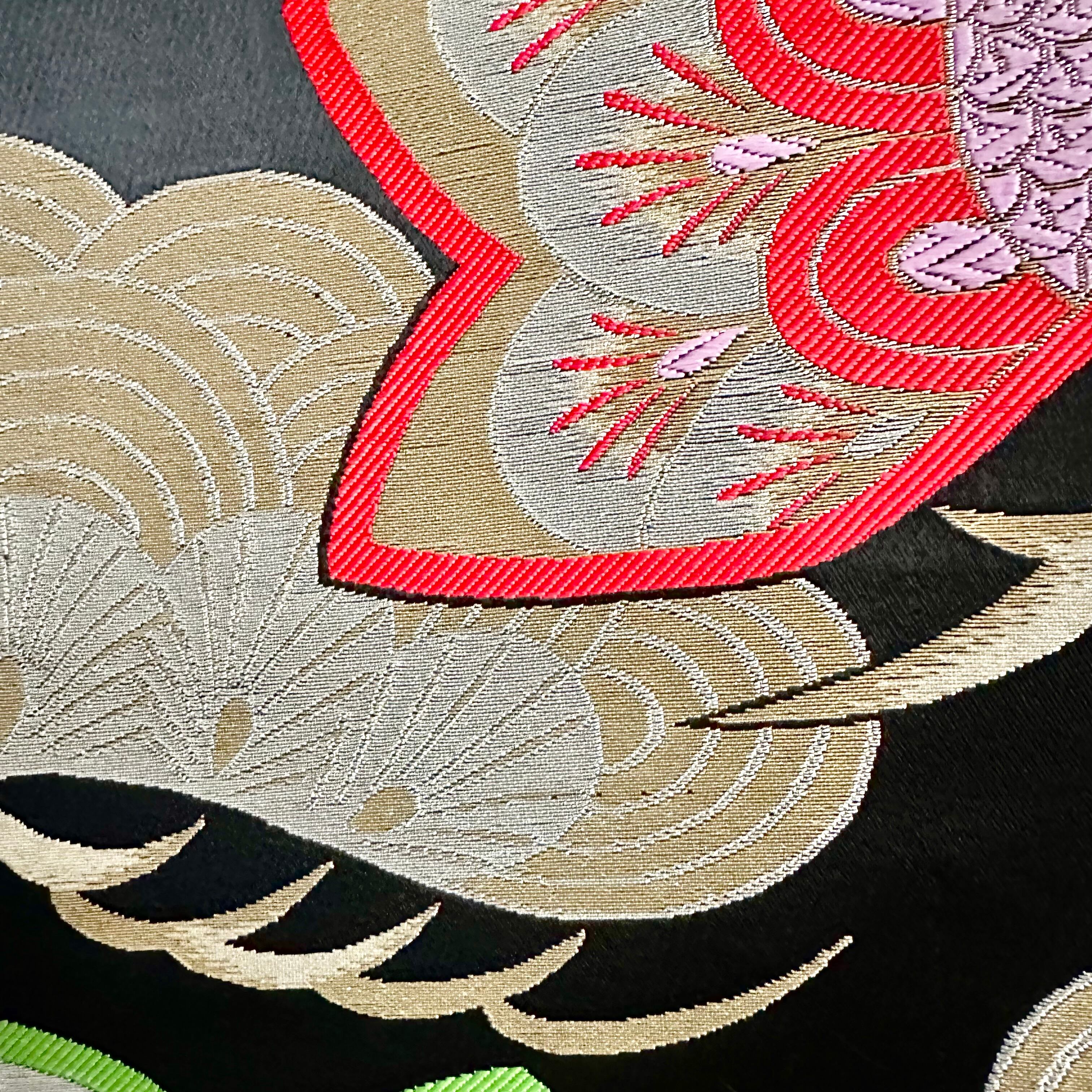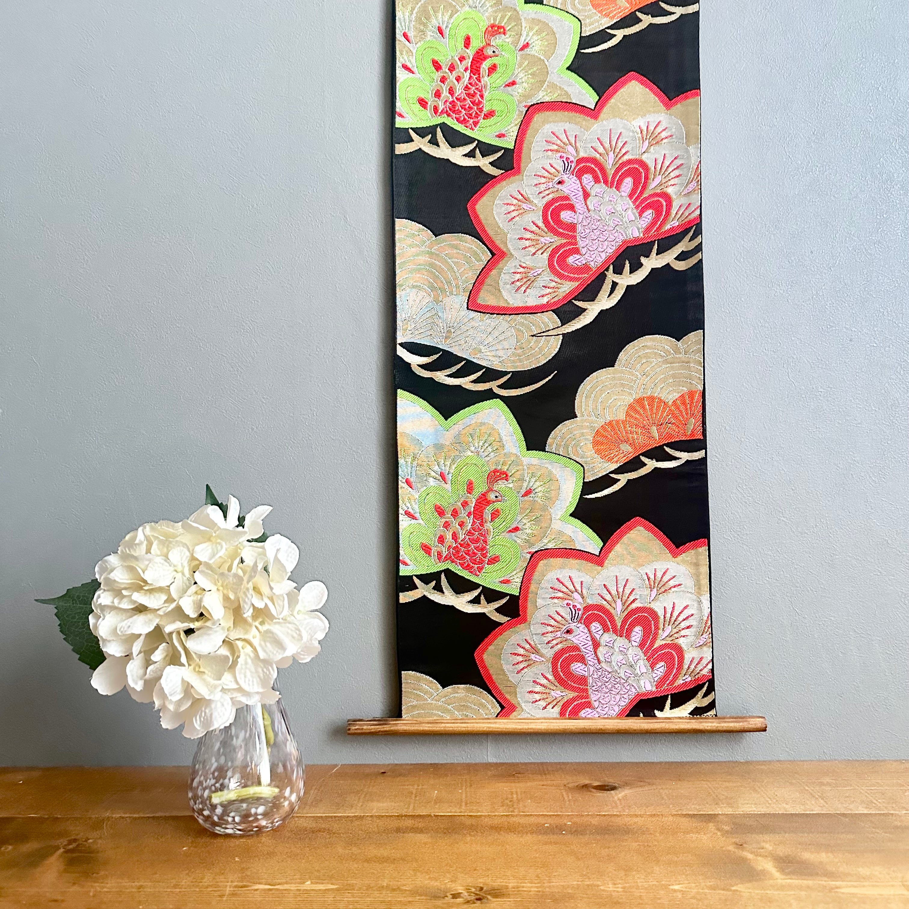 Kimono tapestry 帯のタペストリー 漆黒にレトロな孔雀 Japanese Kimono Interior Art Panel Kakejiku Art Wall Art Kimono Panel | koto1946