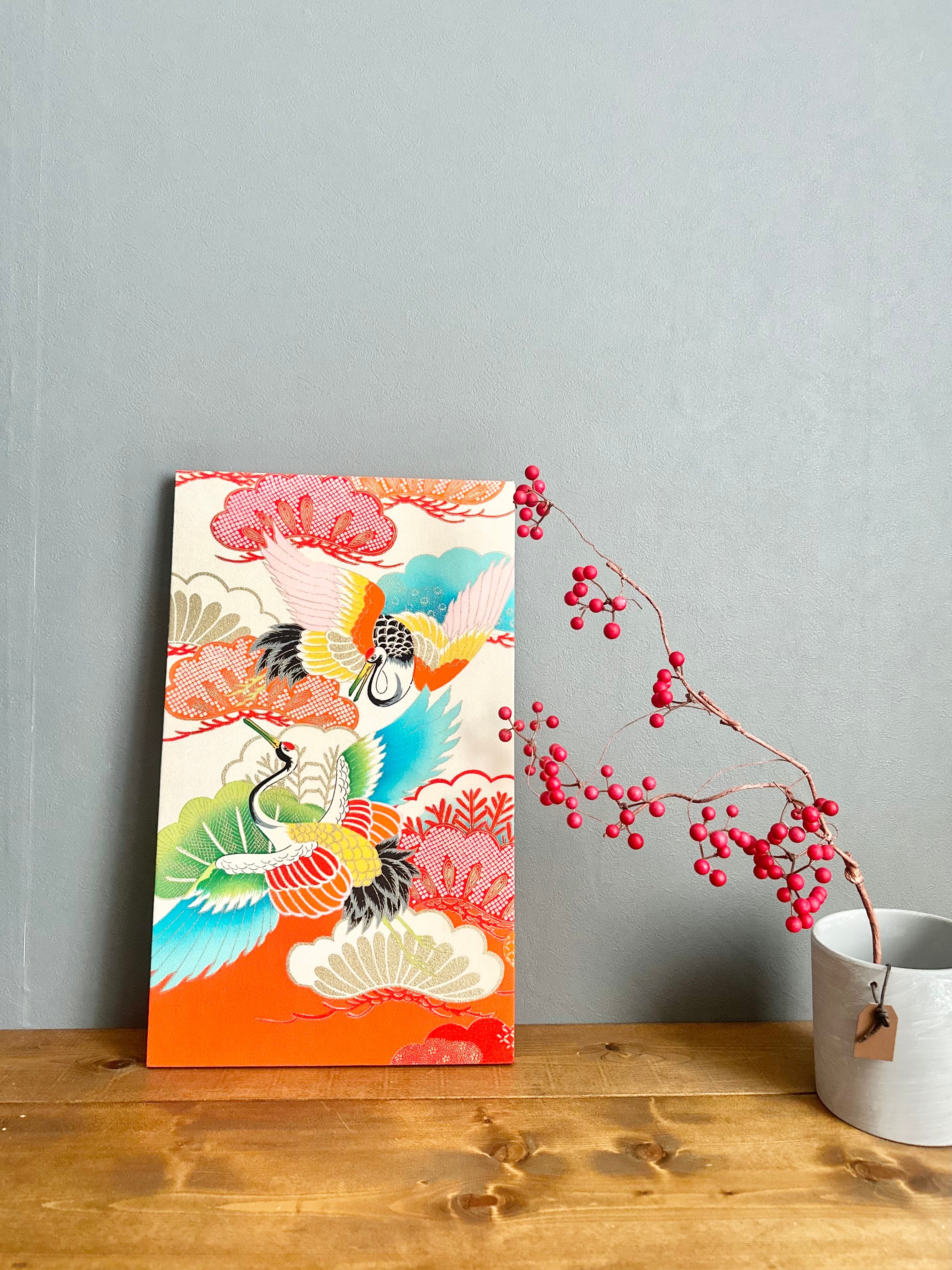 色とりどりの松と羽を広げる鮮やかな鶴。