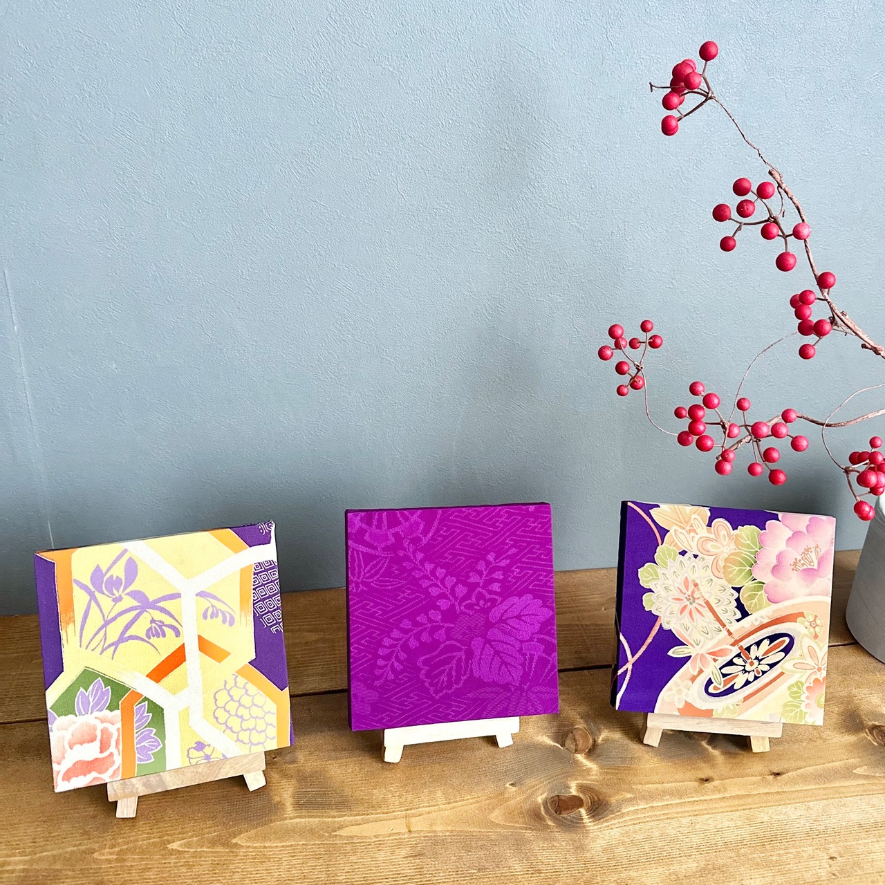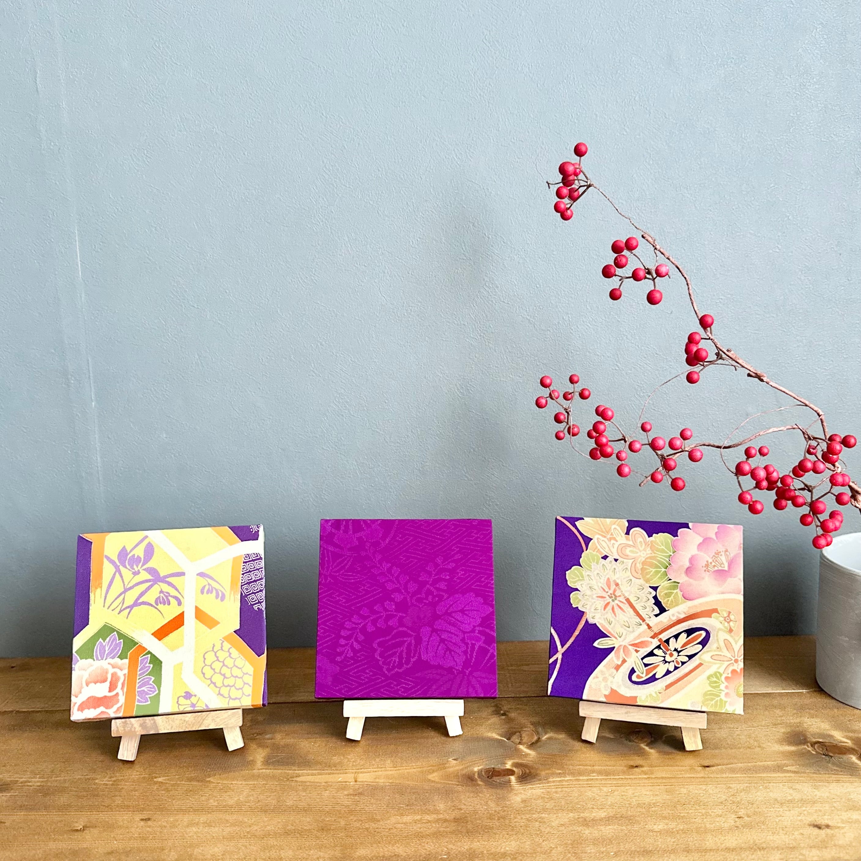Kimono fabric panel 15×15cm 着物のファブリックパネル イロトリドリ 紫に駒(3枚セット) Japanese Kimono Interior Japanese Style Art Panels Kimono panel Washitsu Japanese interior | koto1946