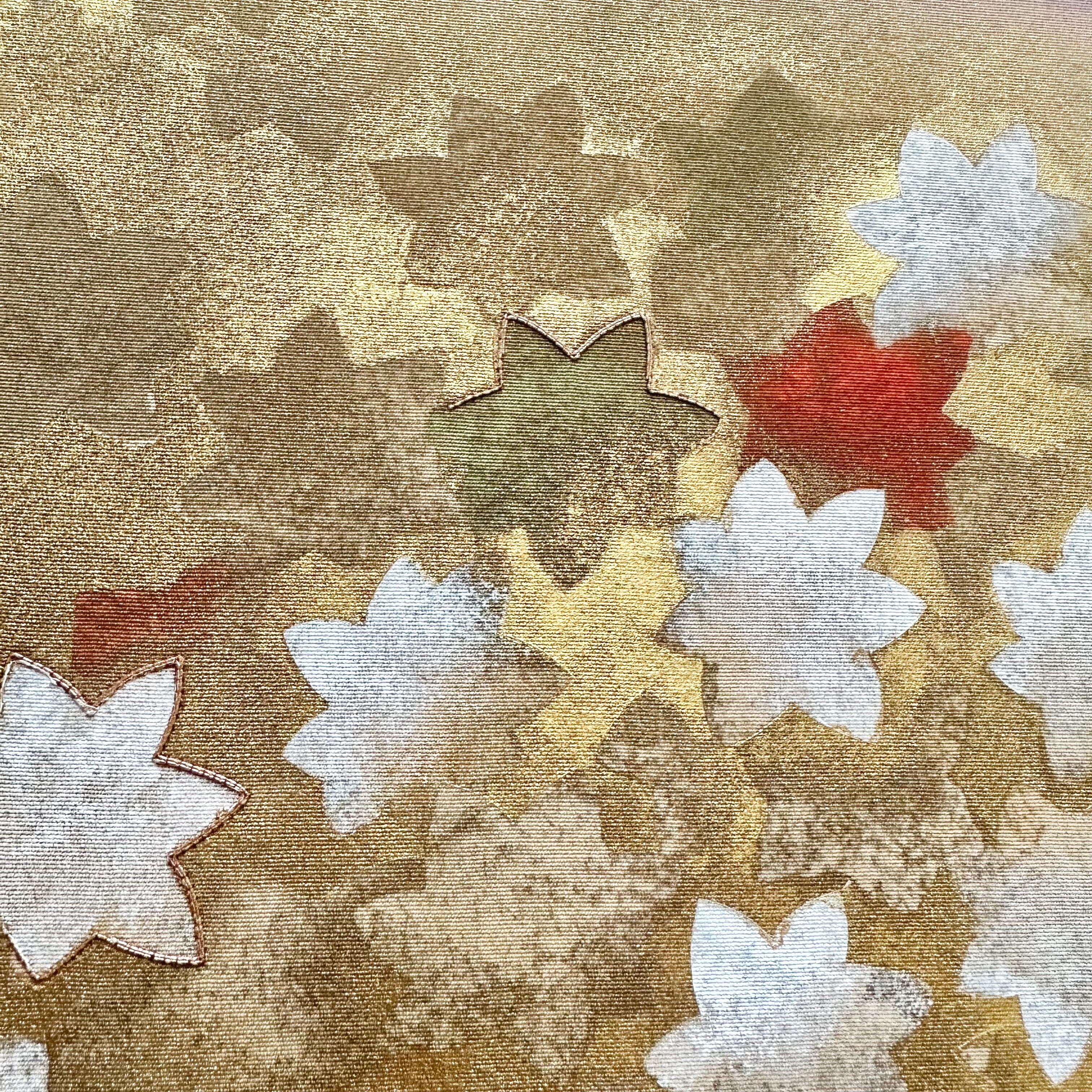 金色に輝く紅葉がお着物いっぱいに広がる、大変豪華で美しい佇まいのファブリックパネル。