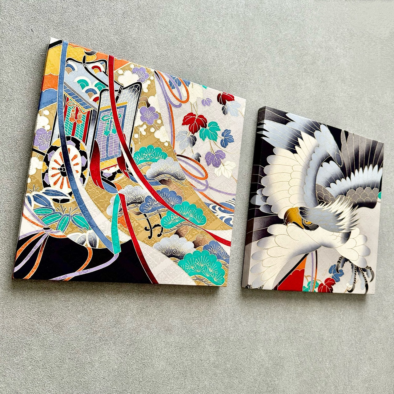 Kimono fabric panel 30×30cm 着物のファブリックパネル 鷹と御者車(2枚セット) Japanese Kimono Interior Japanese Style Art Panels Kimono panel Washitsu Japanese interior | koto1946