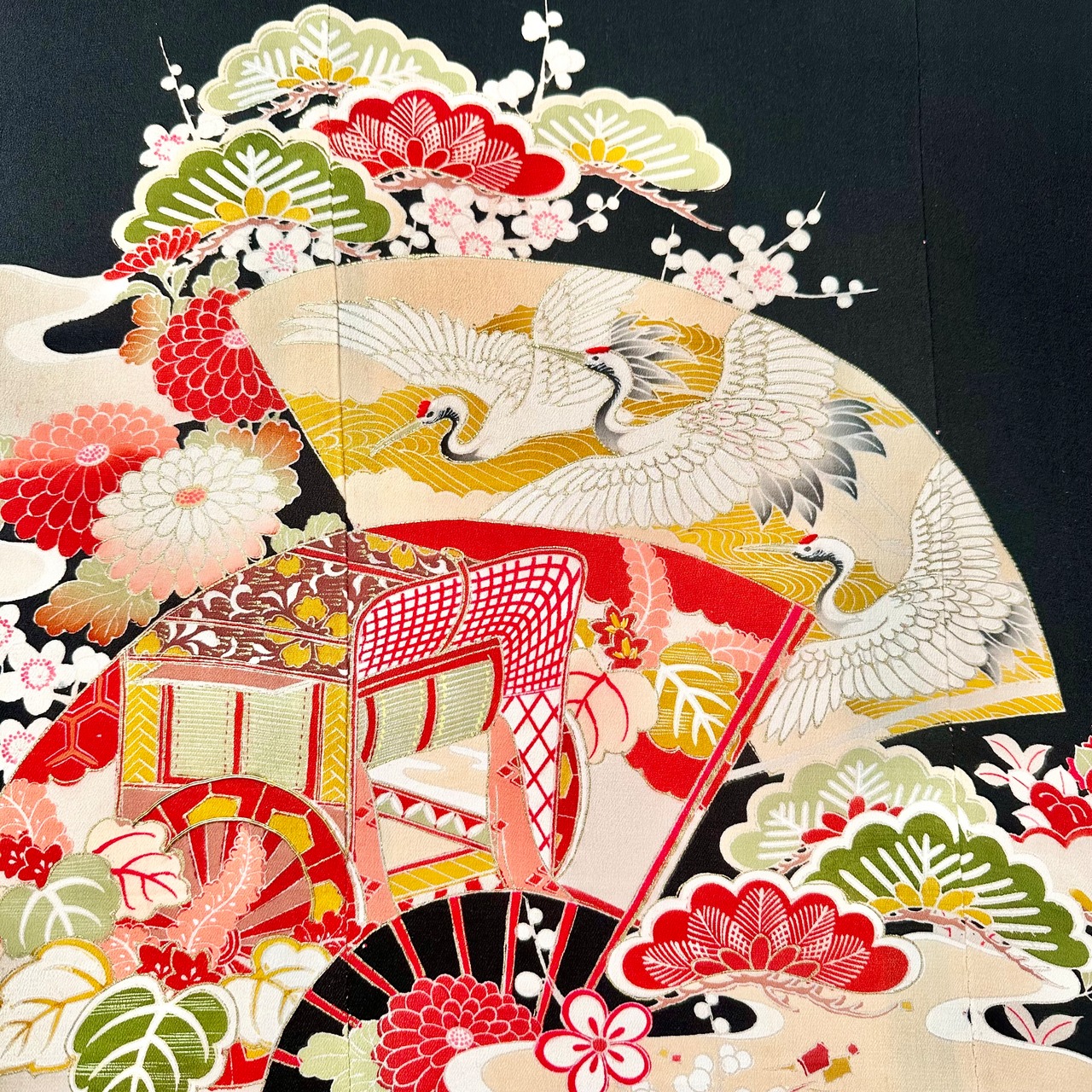 梅や菊、松の雲咲く中に、鶴や御者車の鮮やかな扇。