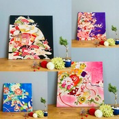 「Antiques」は、特に色鮮やかで美しい、一級品のお着物たちを集め、その色合いと鮮やかな柄行そのままに、大きなサイズでお作りしたファブリックパネルシリーズです。