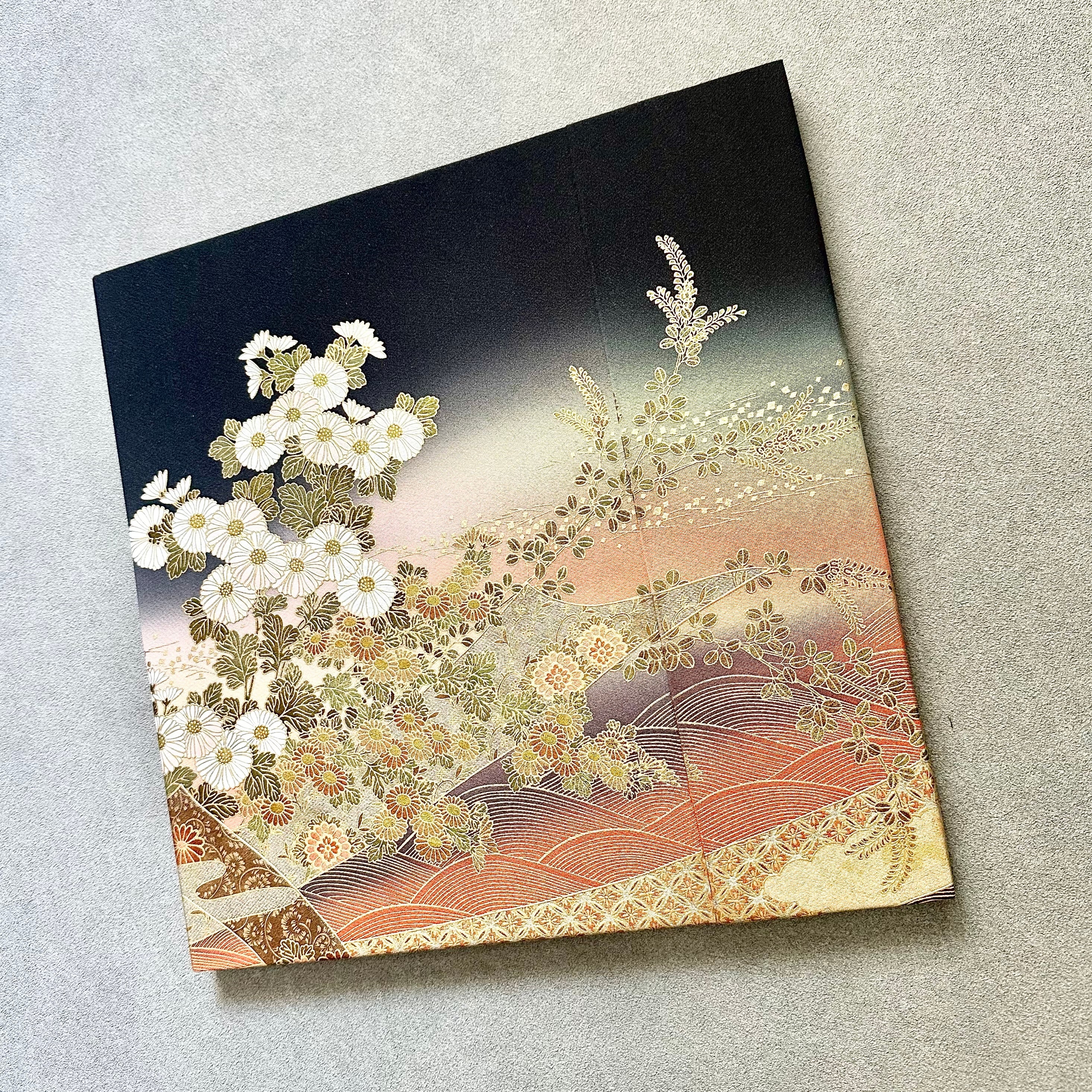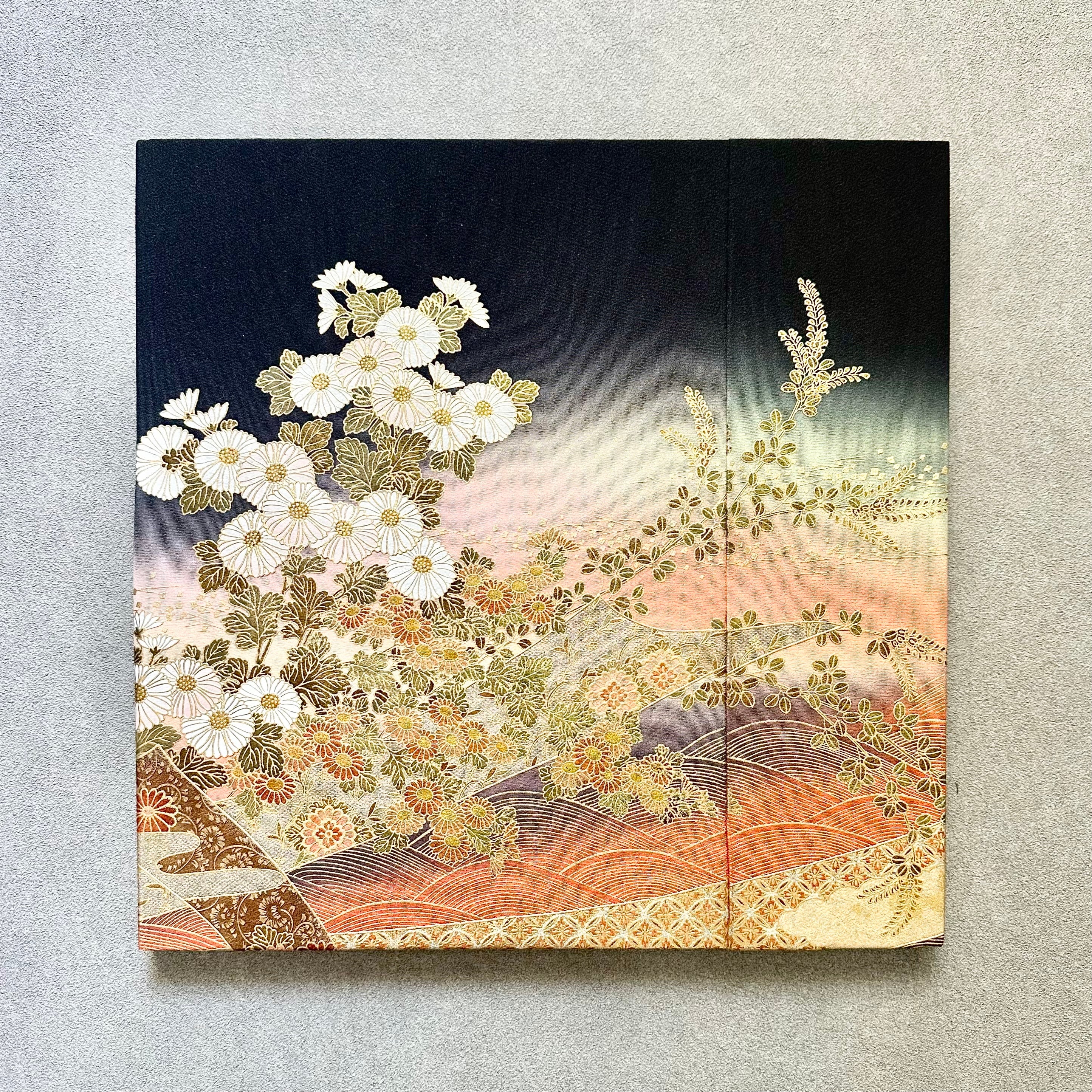 美しい野原に輝き咲く満開の菊花が晴れやかで色合いも素敵な、大変豪華な黒留袖からお作りしたファブリックパネル。