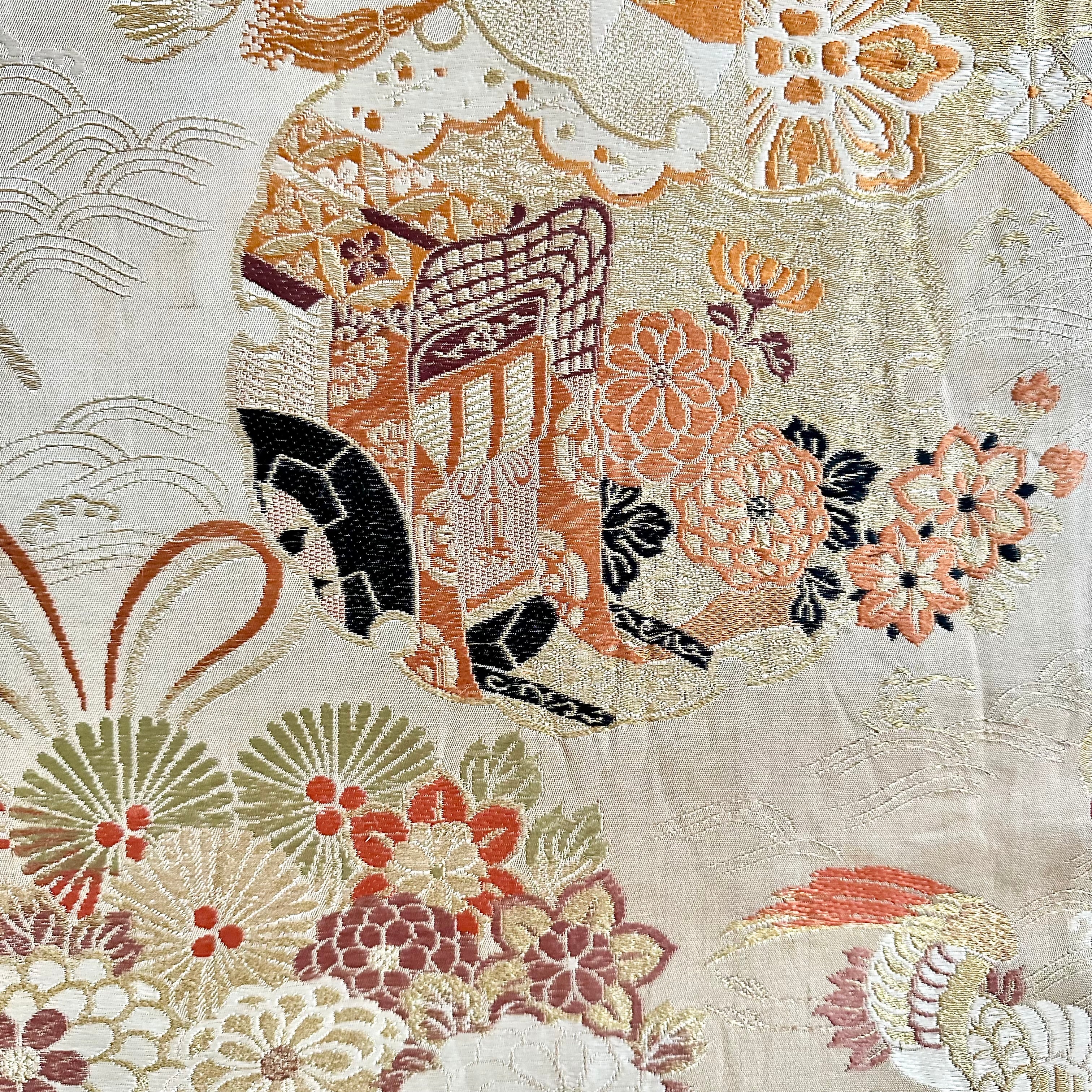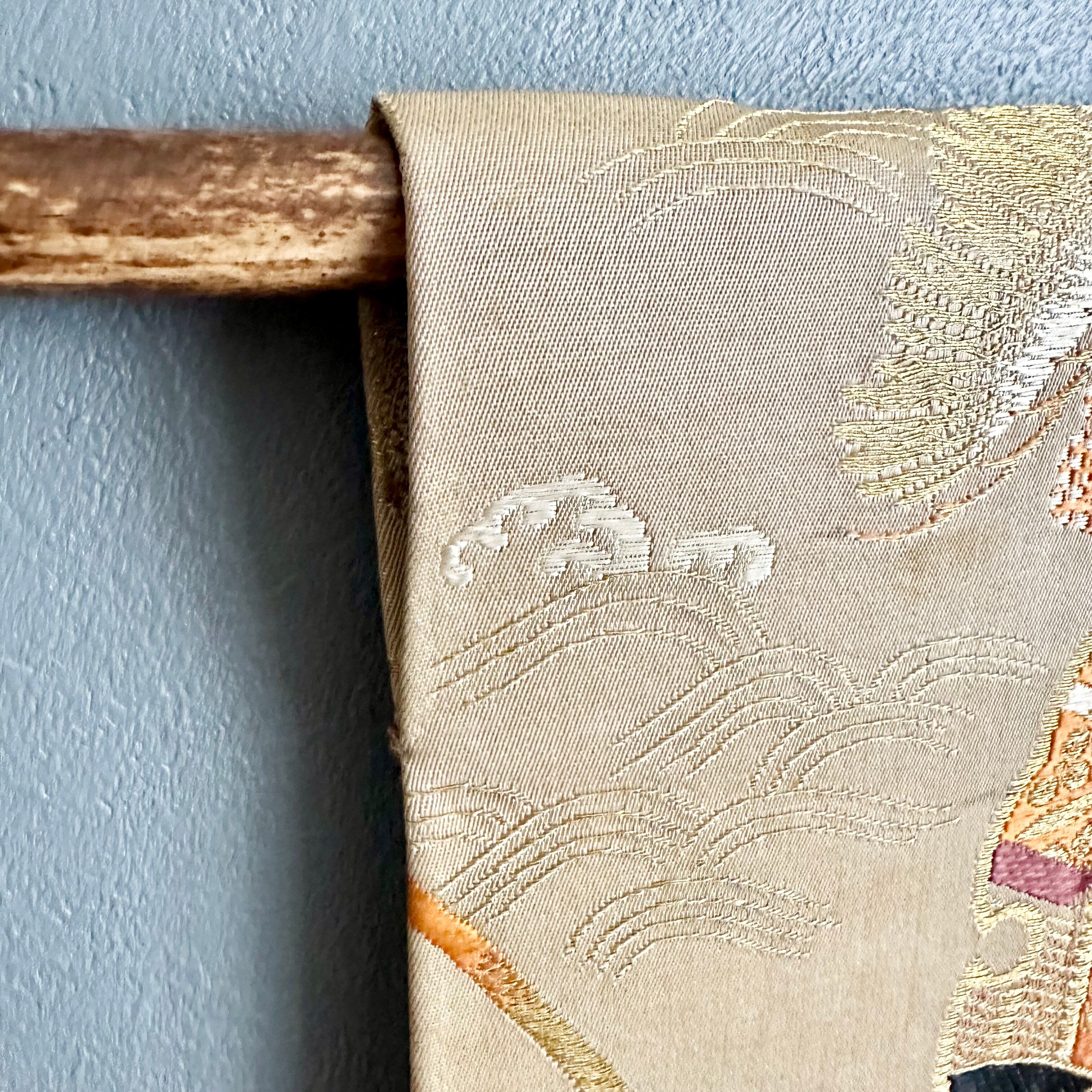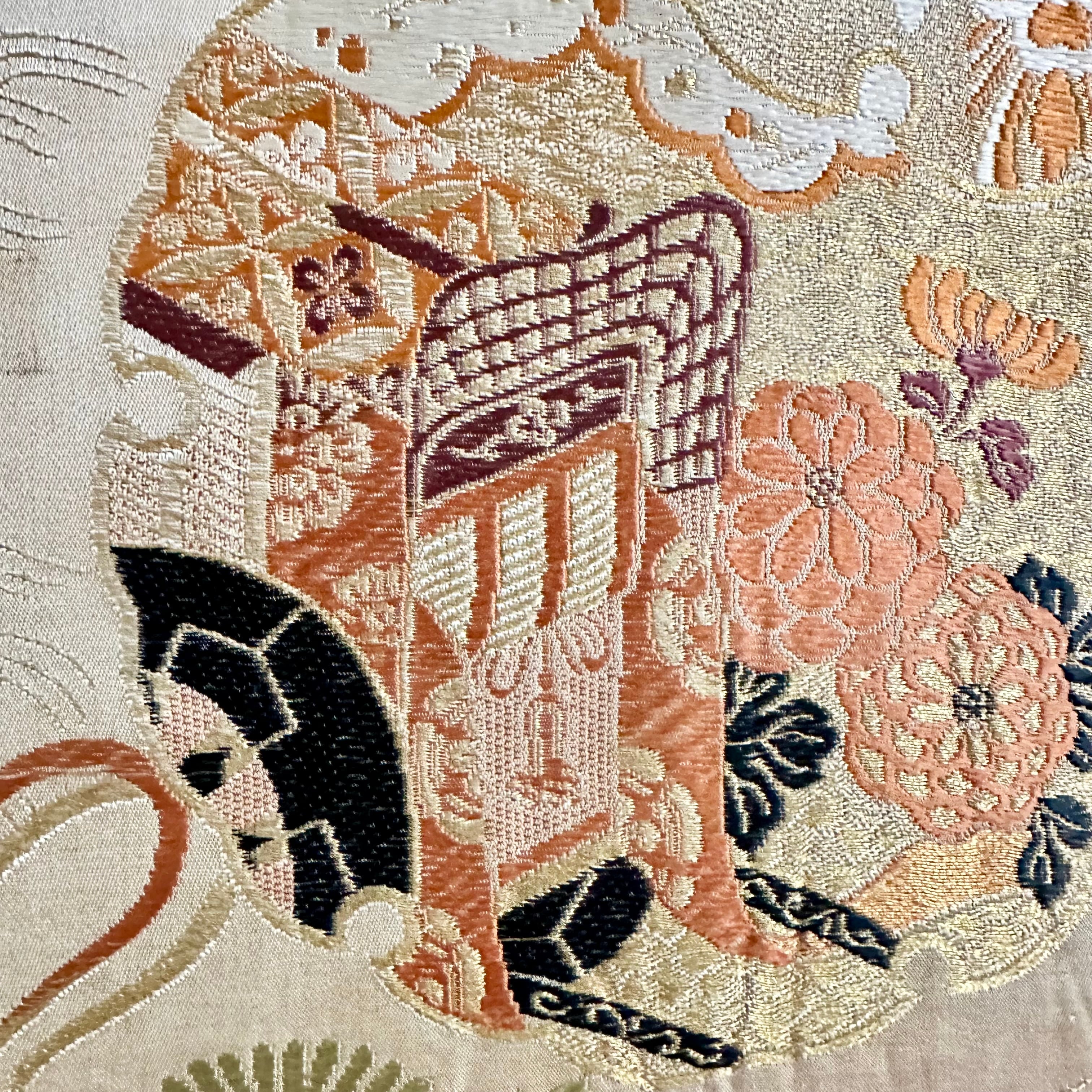 Kimono tapestry 帯のタペストリー アンティーク 花薬玉に御者車 Japanese Kimono Interior Art Panel Kakejiku Art Wall Art Kimono Panel | koto1946
