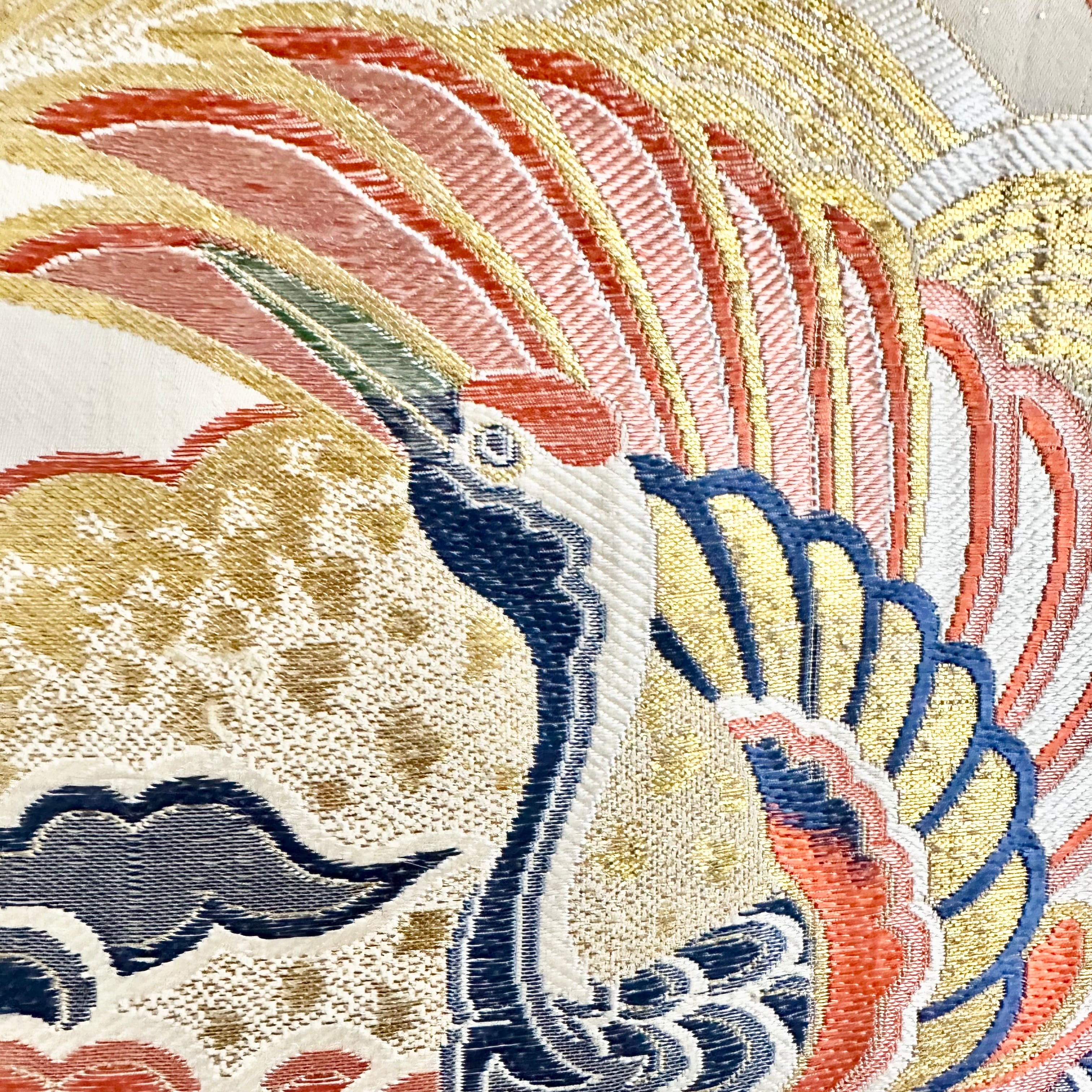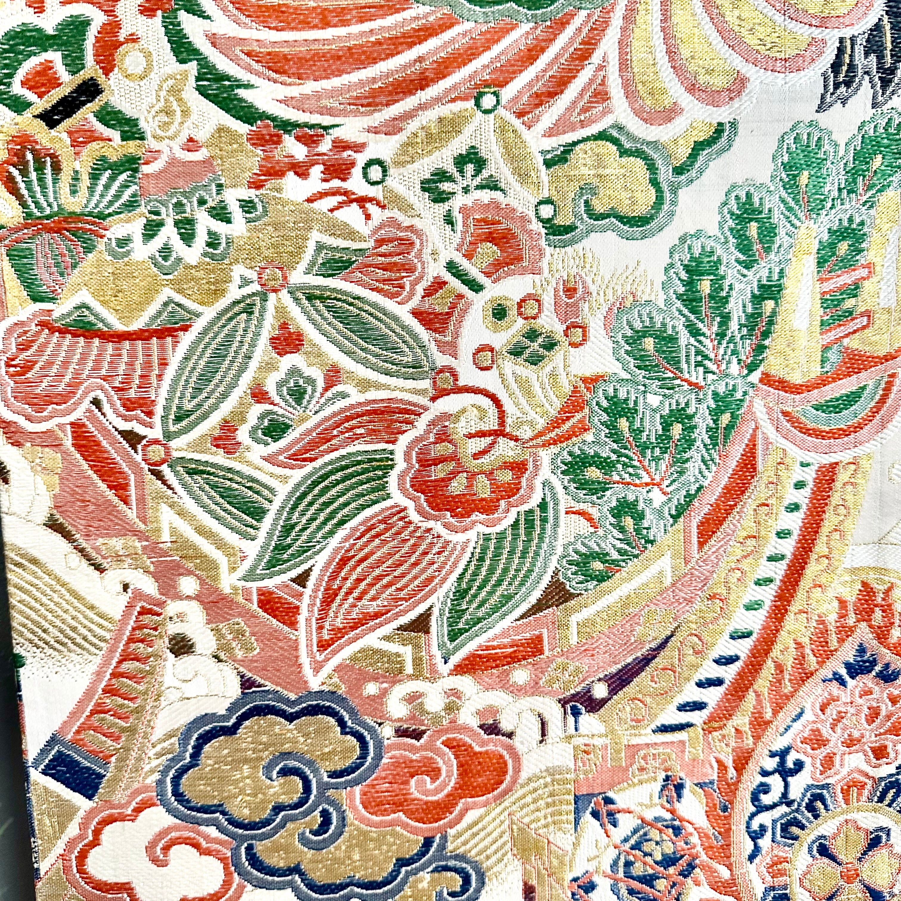 縁起物の並ぶ、大変美しい帯からお作りしたタペストリーです。