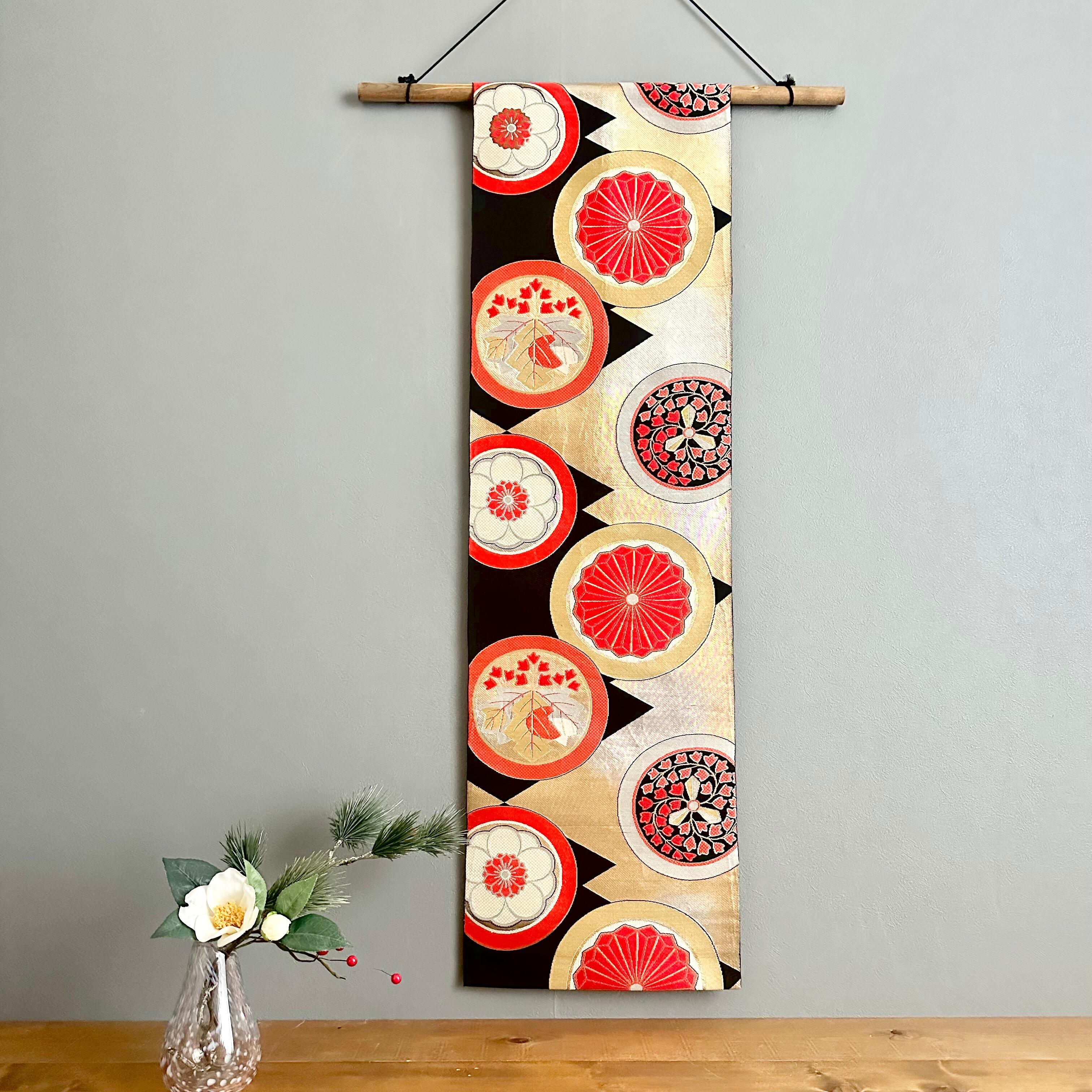 Kimono tapestry 帯のタペストリー ヴィンテージ 漆黒に家紋柄 Japanese Kimono Interior Art Panel Kakejiku Art Wall Art Kimono Panel | koto1946