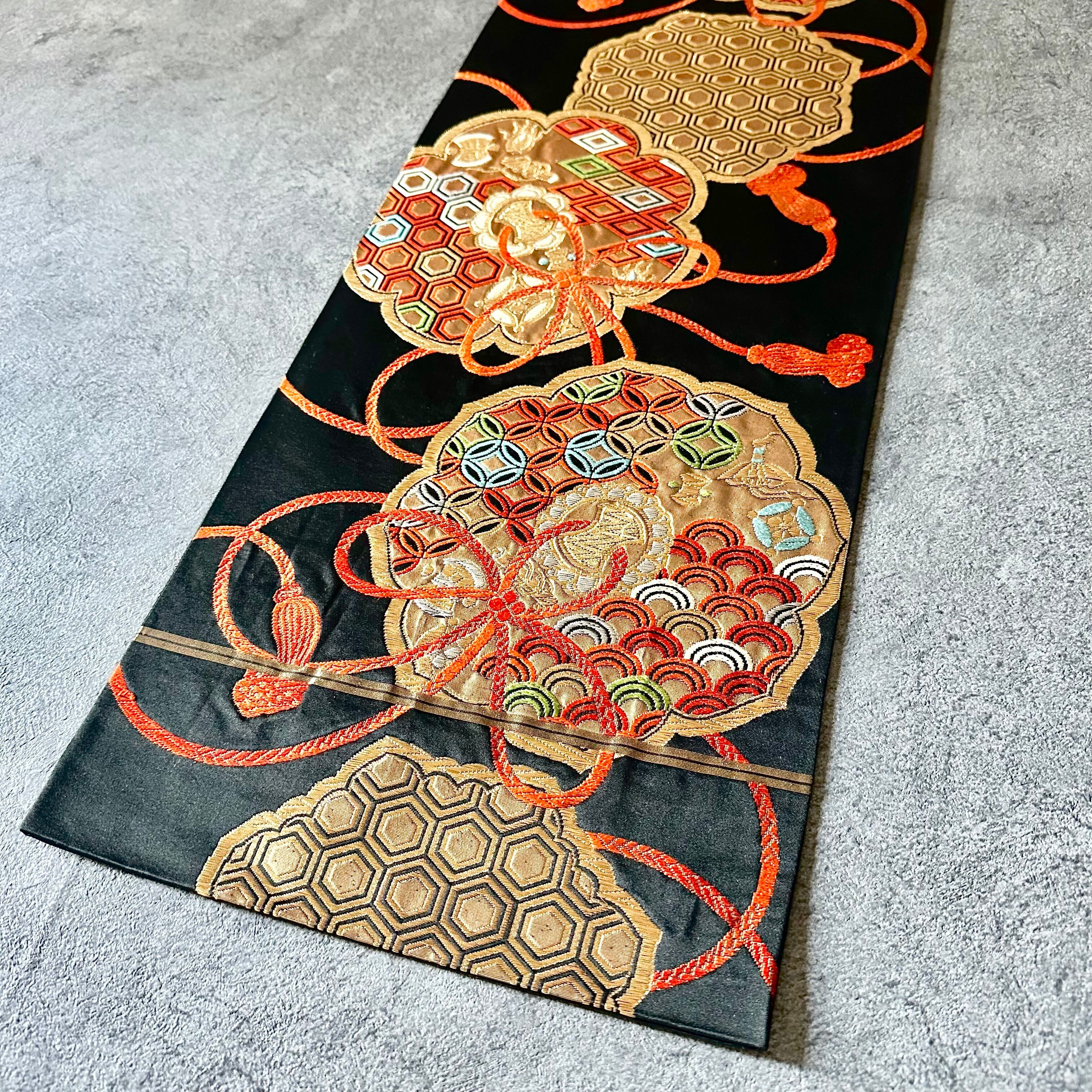 Kimono Table Runner 帯のテーブルランナー 漆黒に鏡裏文 撥水加工 Japanese Kimono Interior Art Panel Kakejiku Art Wall Art Kimono Panel