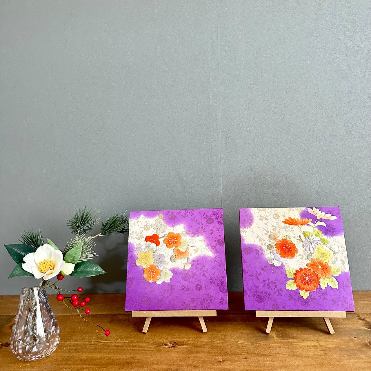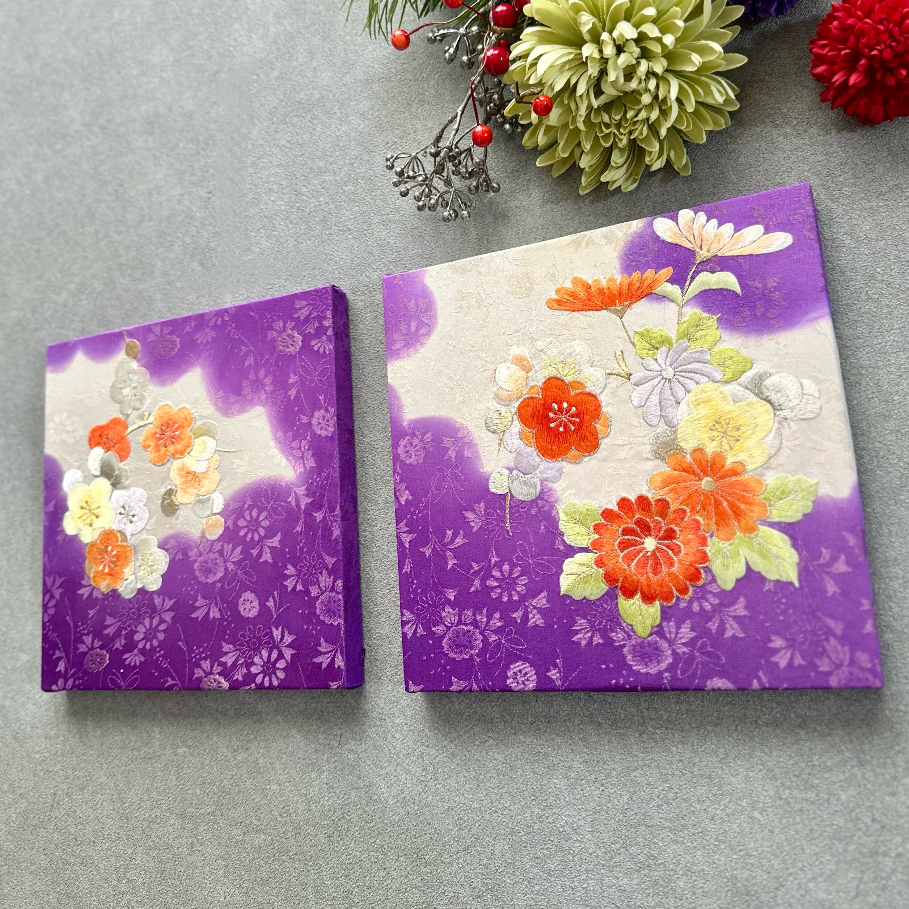 Kimono fabric panel 22×22cm 着物のファブリックパネル 紫に刺繍の花(2枚セット) Japanese Kimono Interior Japanese Style Art Panels Kimono panel Washitsu Japanese interior | koto1946