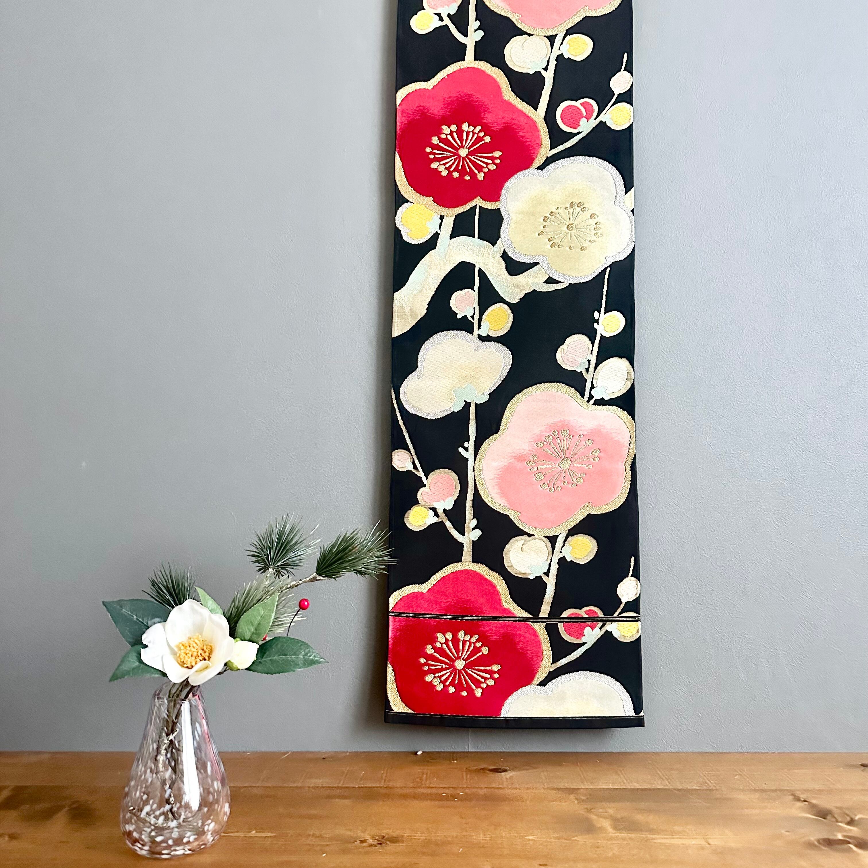 Kimono tapestry 帯のタペストリー 漆黒にとりどりの梅 Japanese Kimono Interior Art Panel Kakejiku Art Wall Art Kimono Panel | koto1946