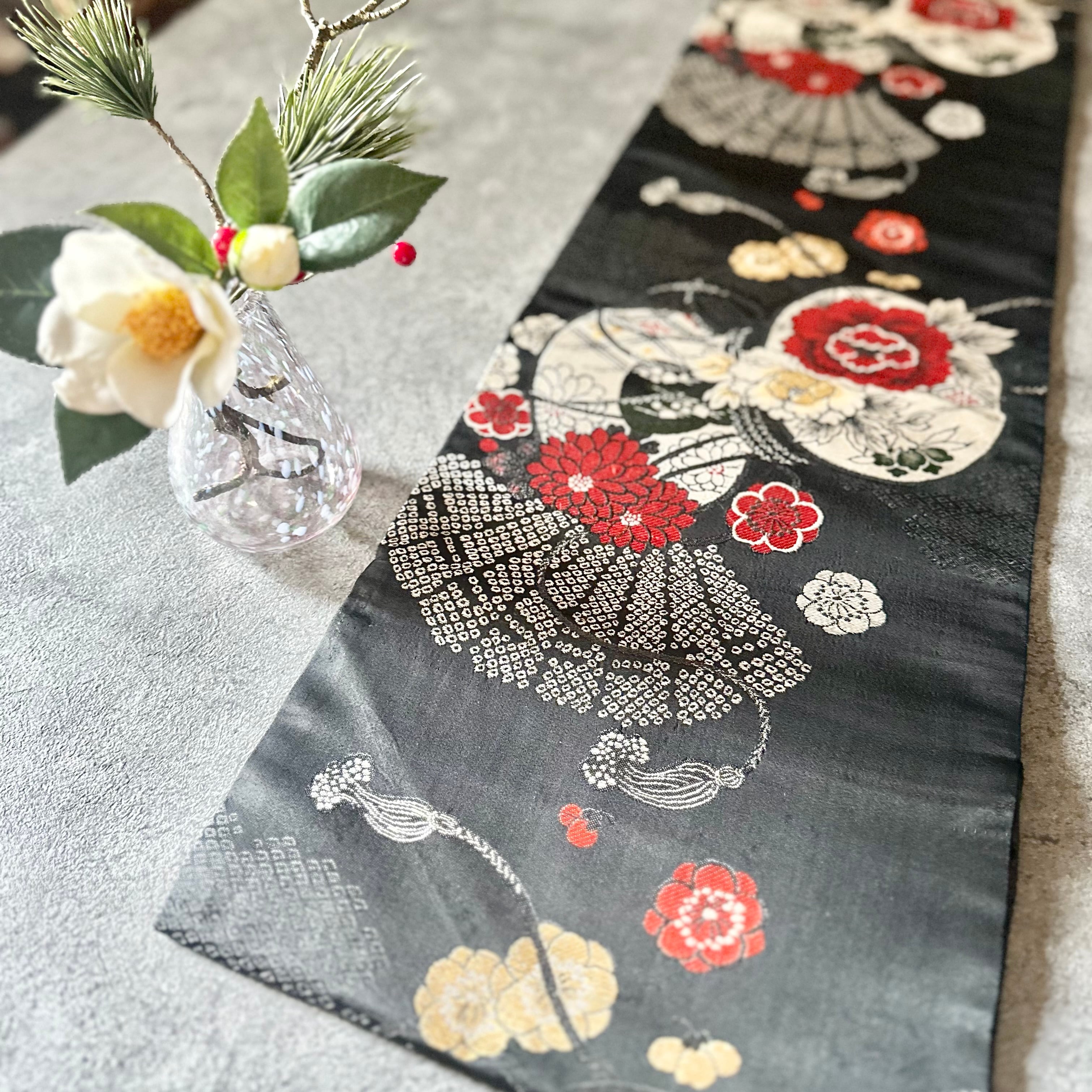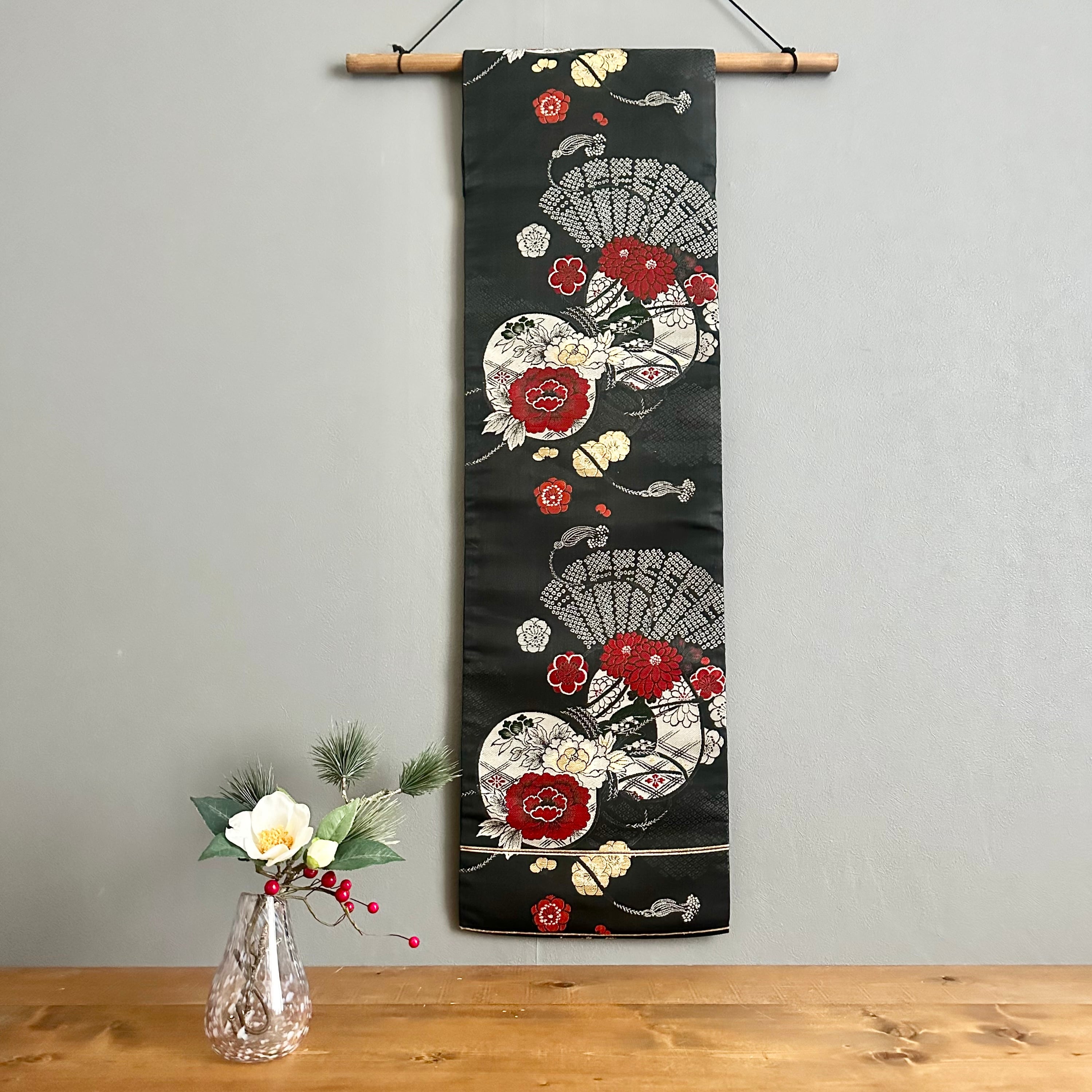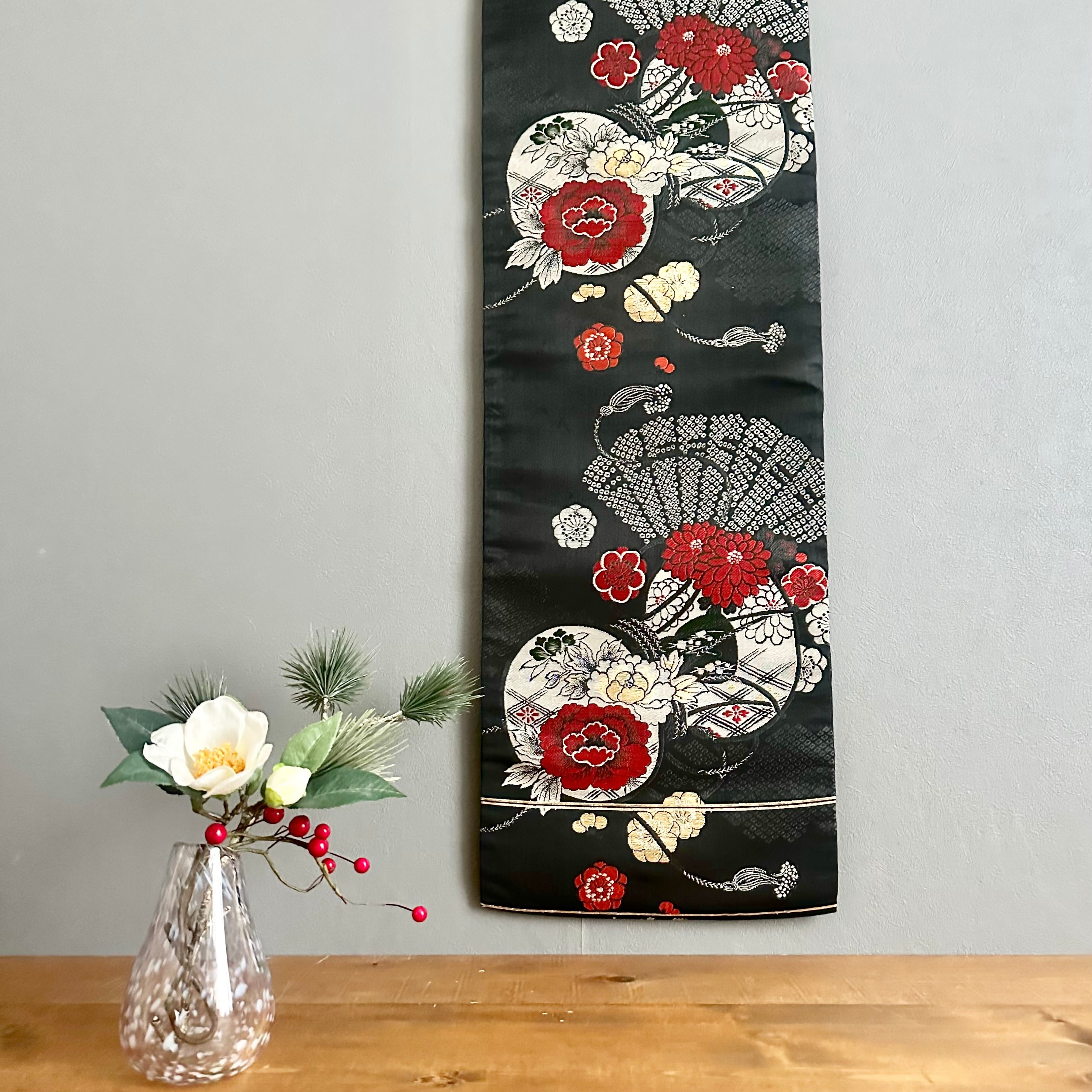 晴れやかな柄行の並ぶ帯からお作りした、お正月などのハレの日にもぴったりのタペストリーです。