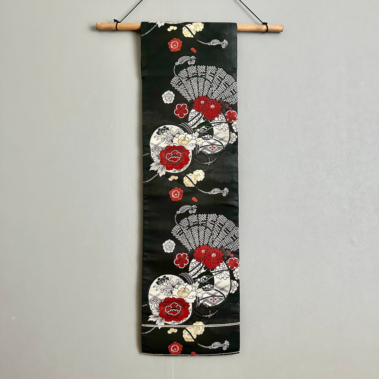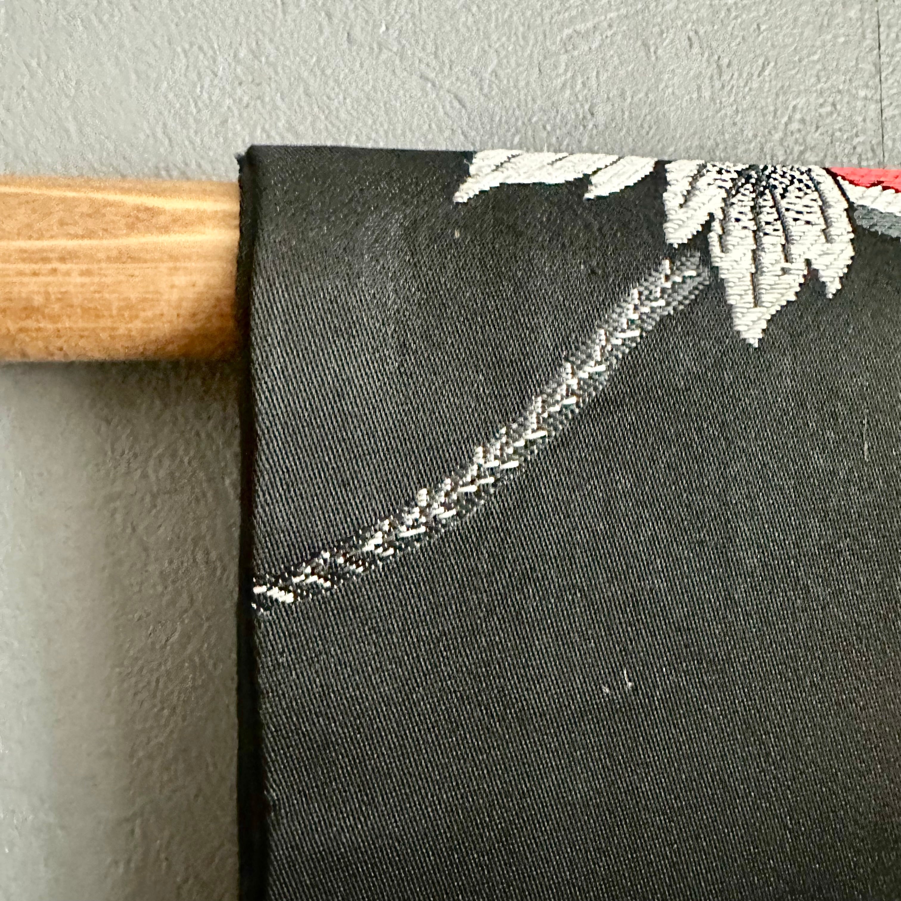 すぐに飾っていただけるよう、タペストリーと棒、黒の紐のセットとなっております。