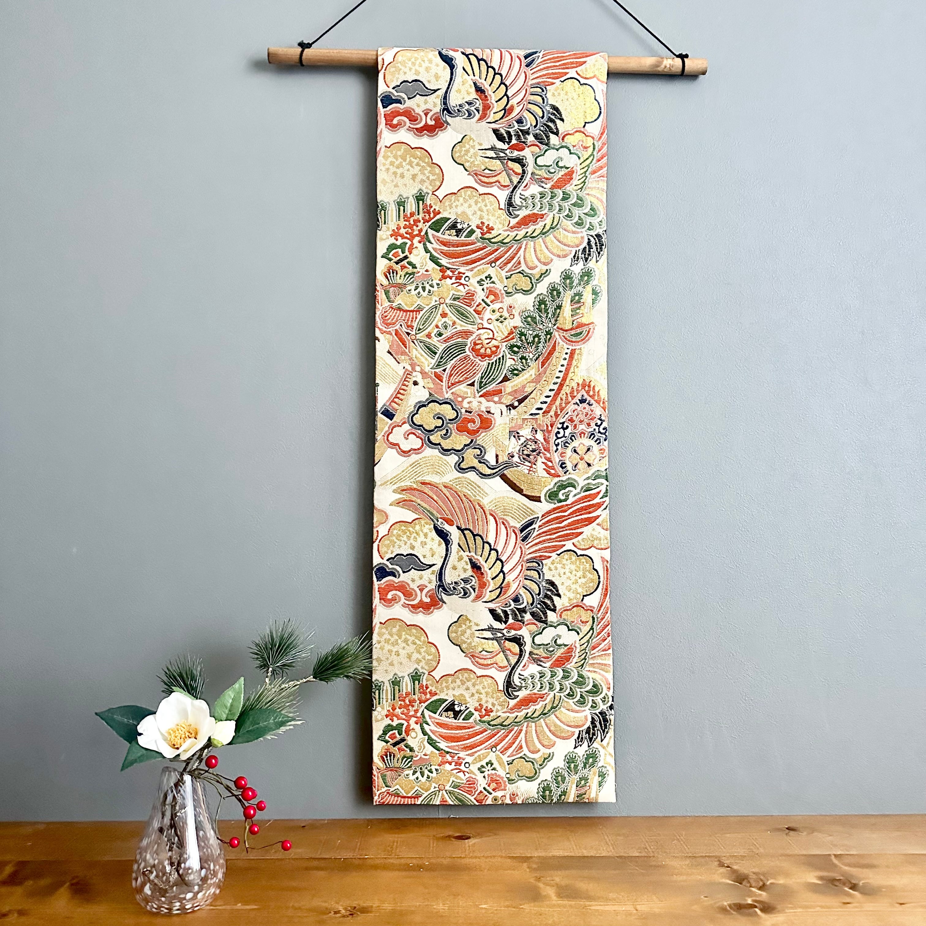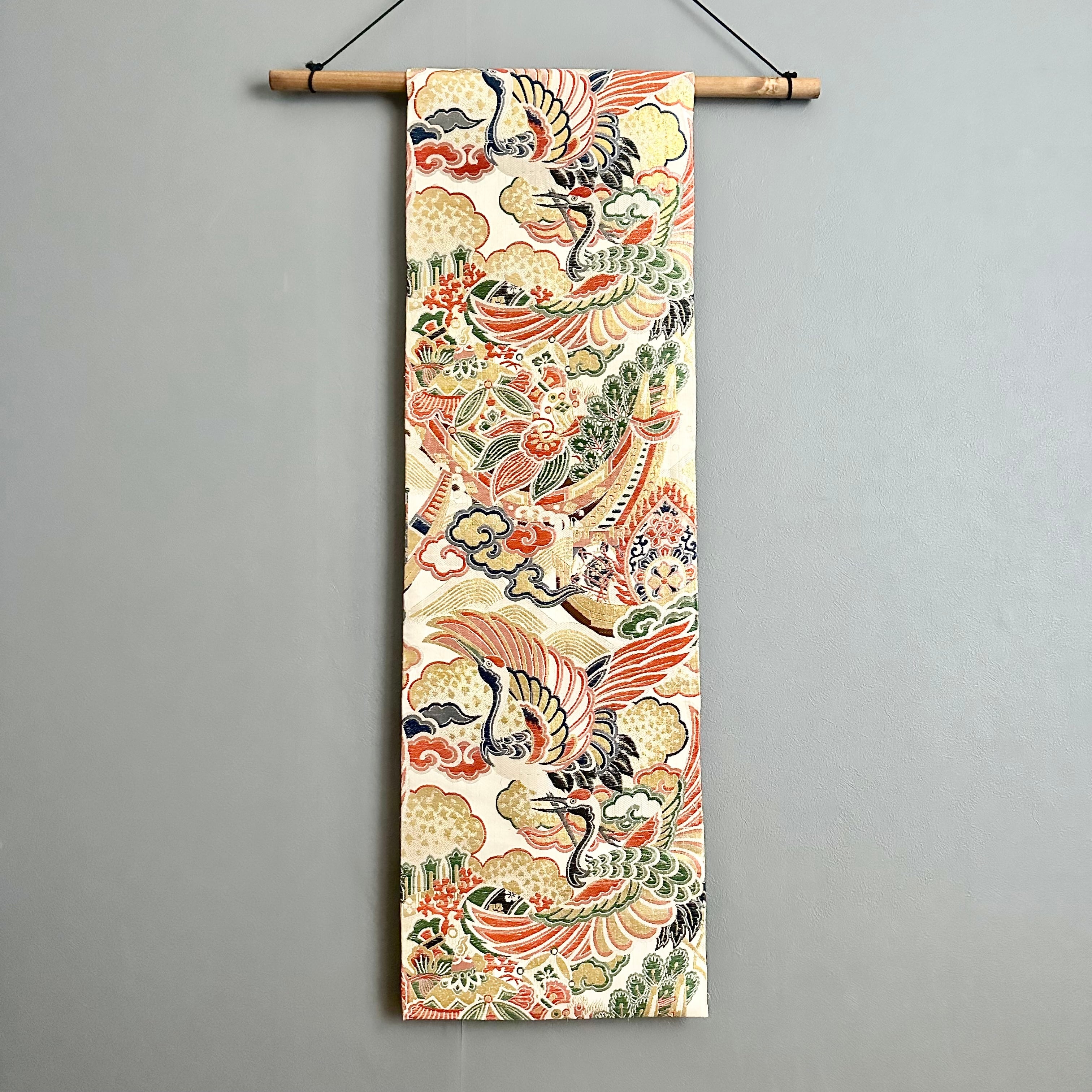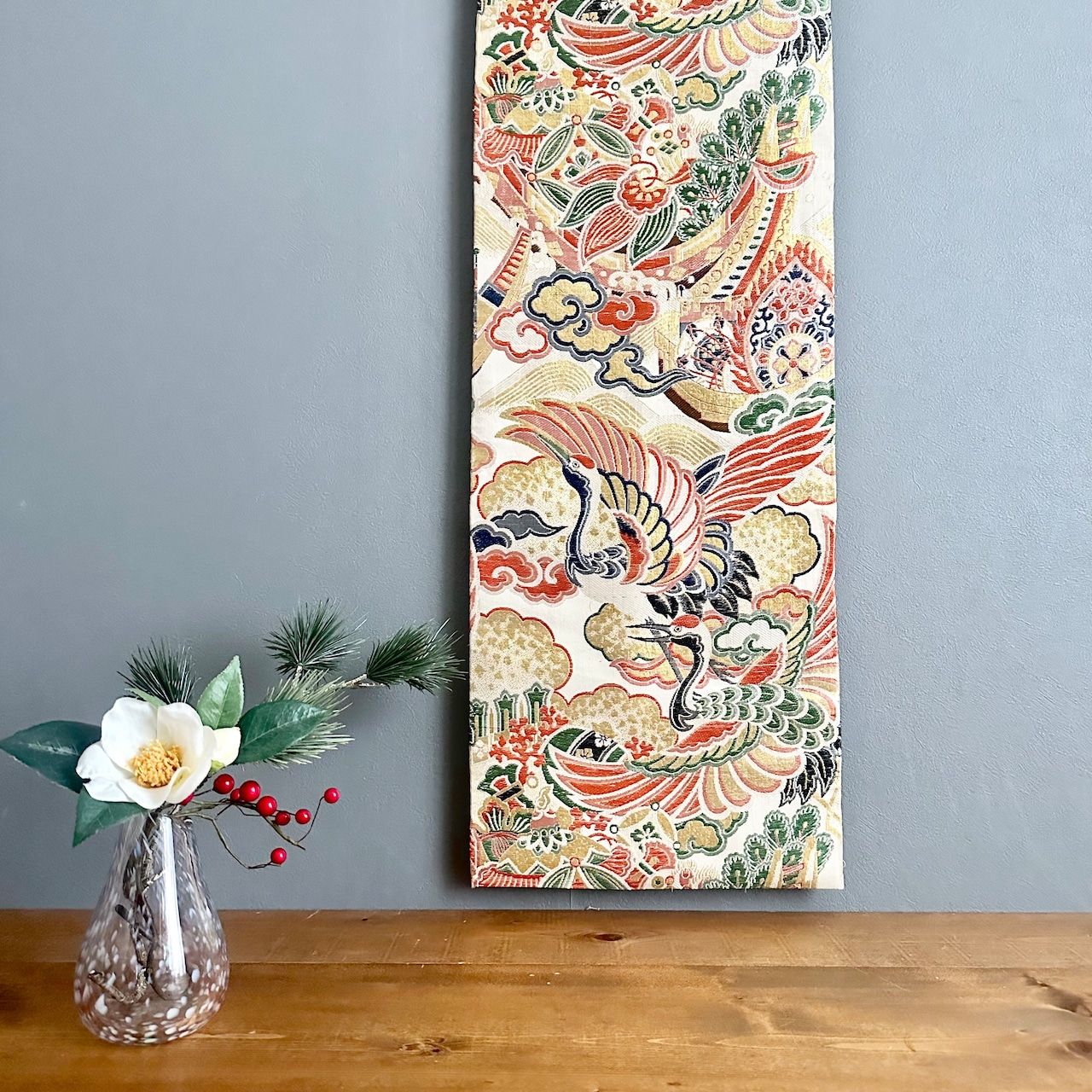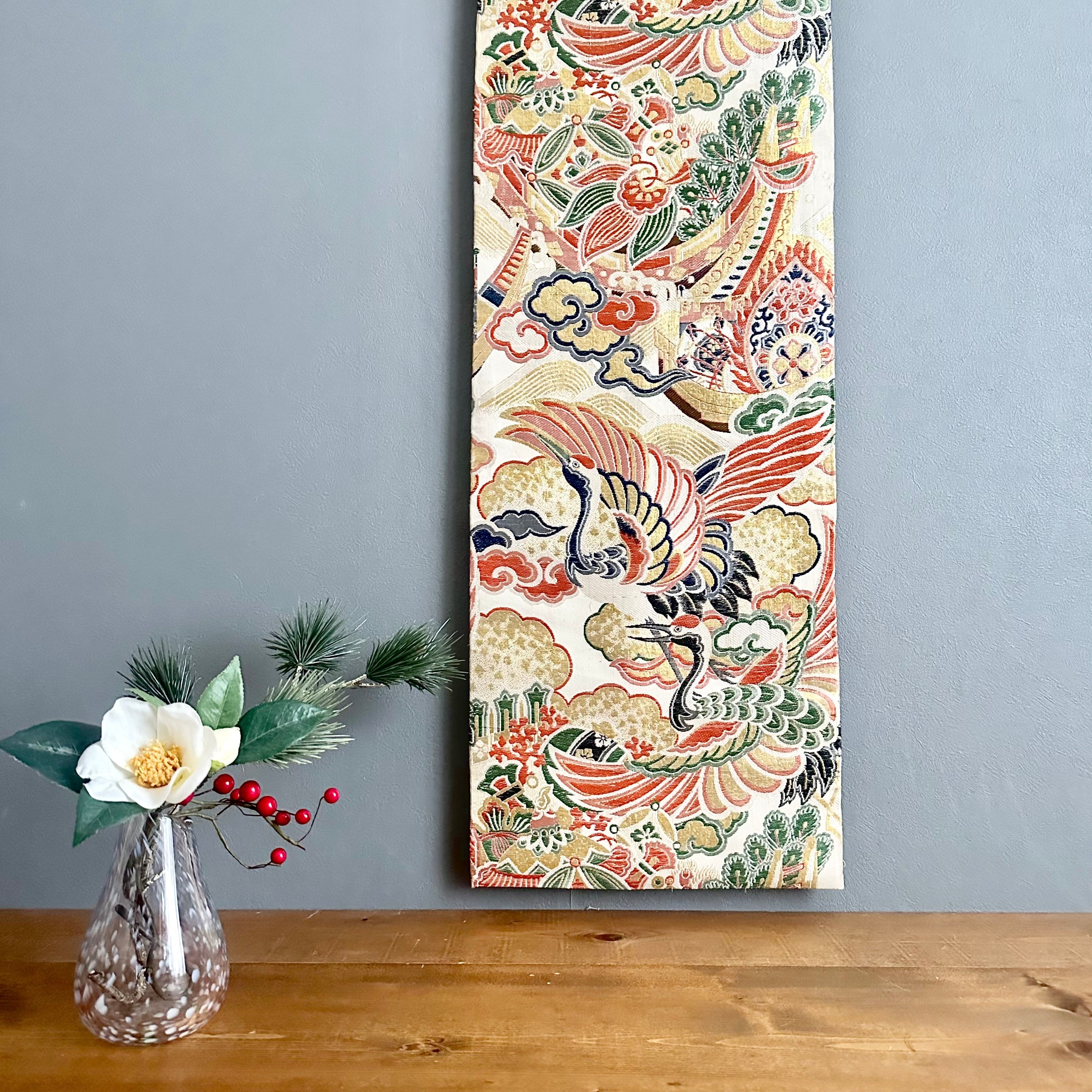 Kimono tapestry 帯のタペストリー ヴィンテージ 鶴と宝船 Japanese Kimono Interior Art Panel Kakejiku Art Wall Art Kimono Panel | koto1946