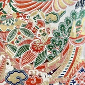 縁起物の並ぶ、大変美しい帯からお作りしたタペストリーです。