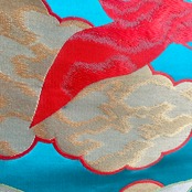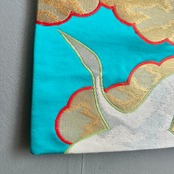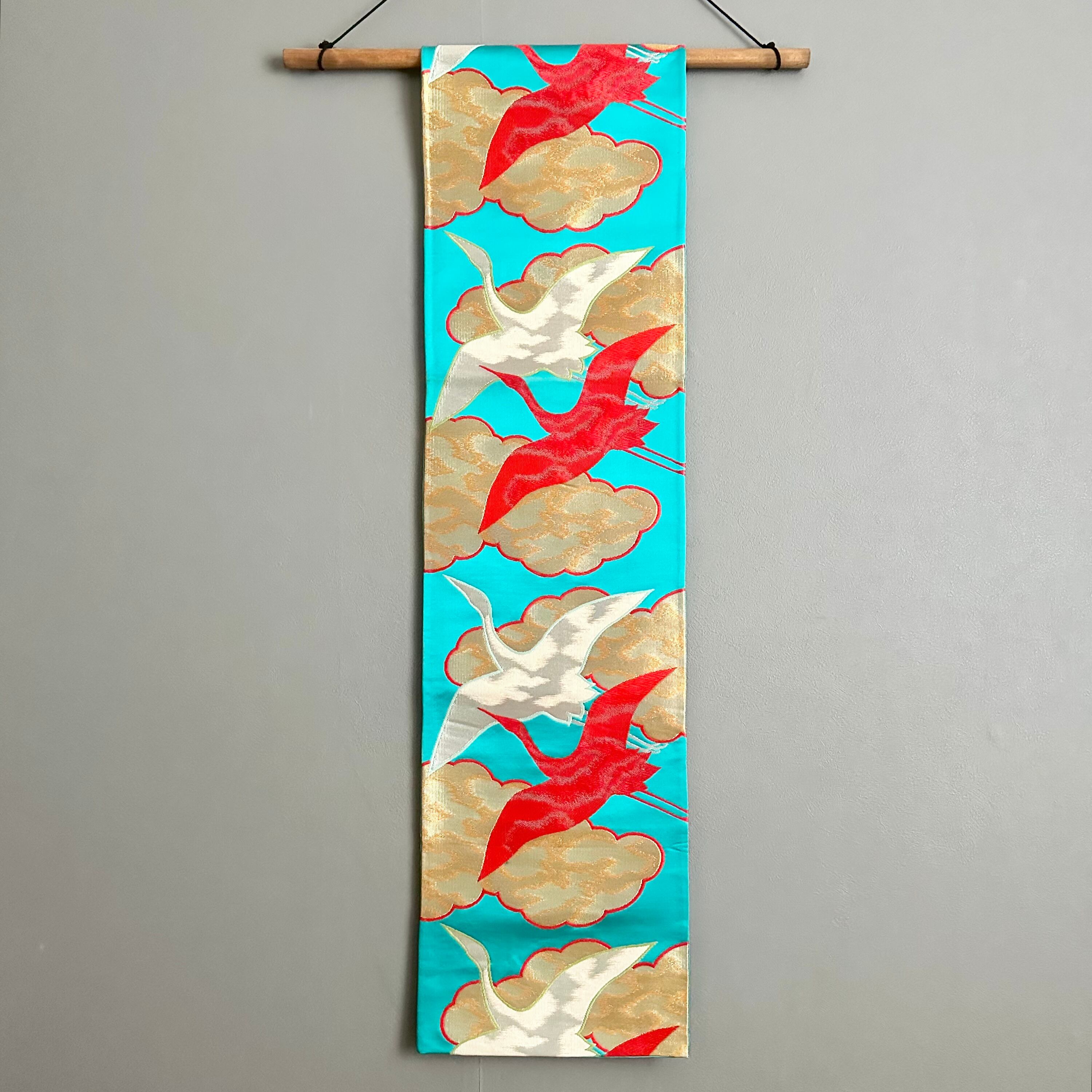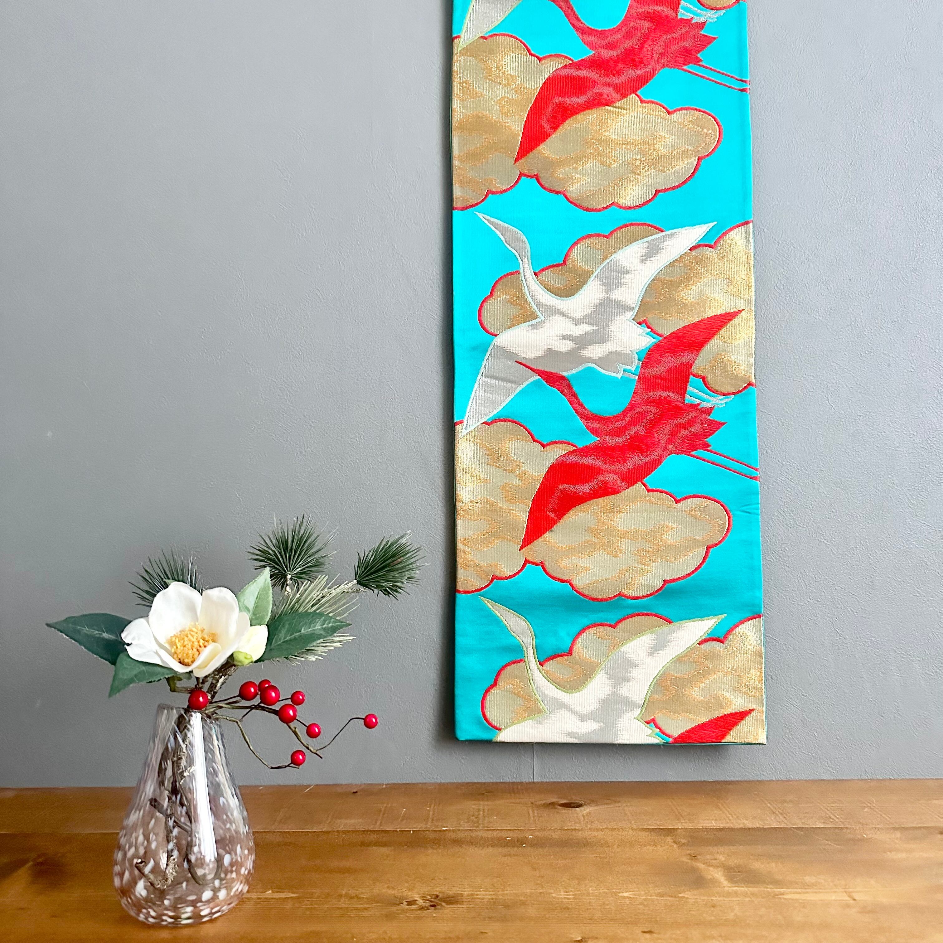 Kimono tapestry 帯のタペストリー ヴィンテージ 空色に金色の雲と鶴 Japanese Kimono Interior Art Panel Kakejiku Art Wall Art Kimono Panel | koto1946