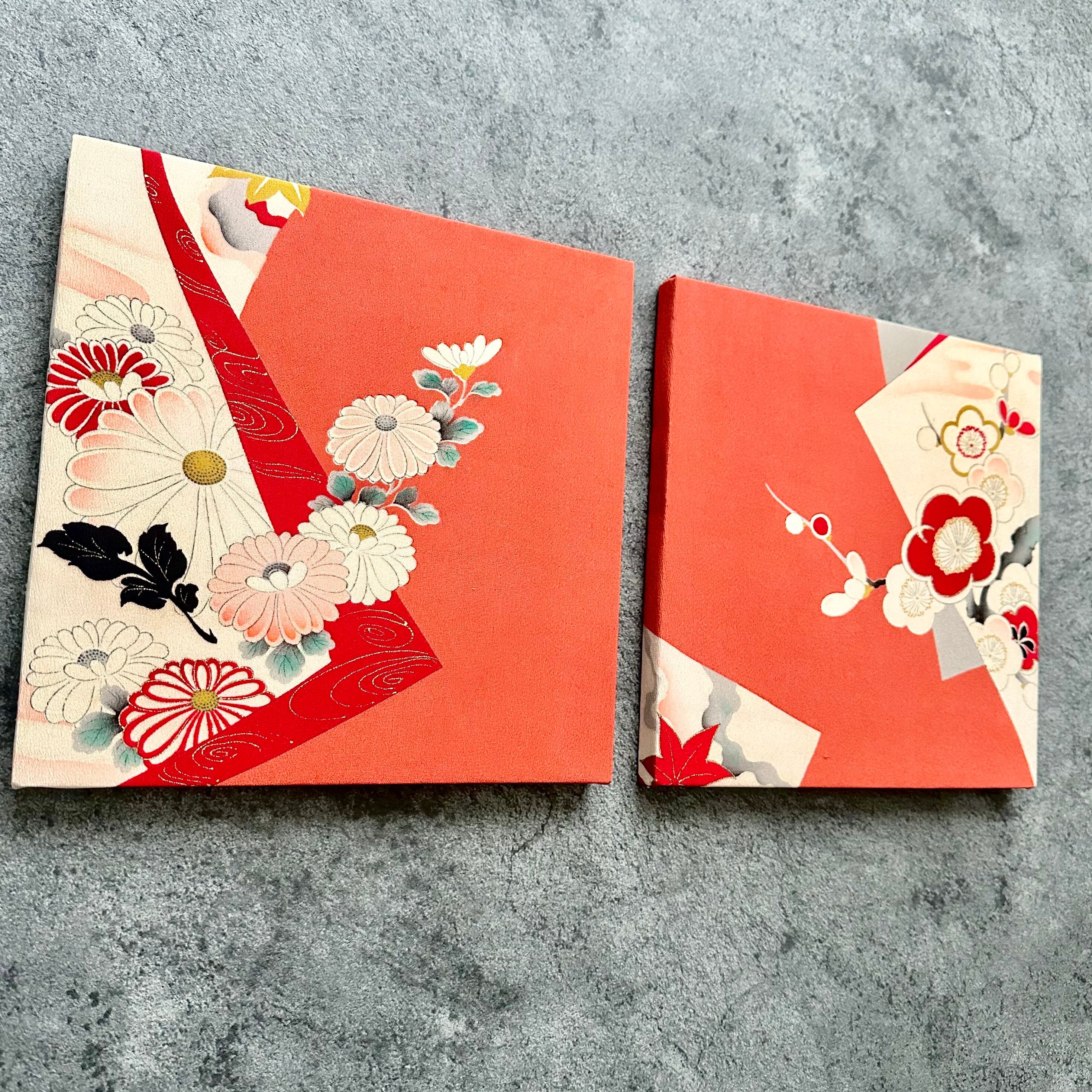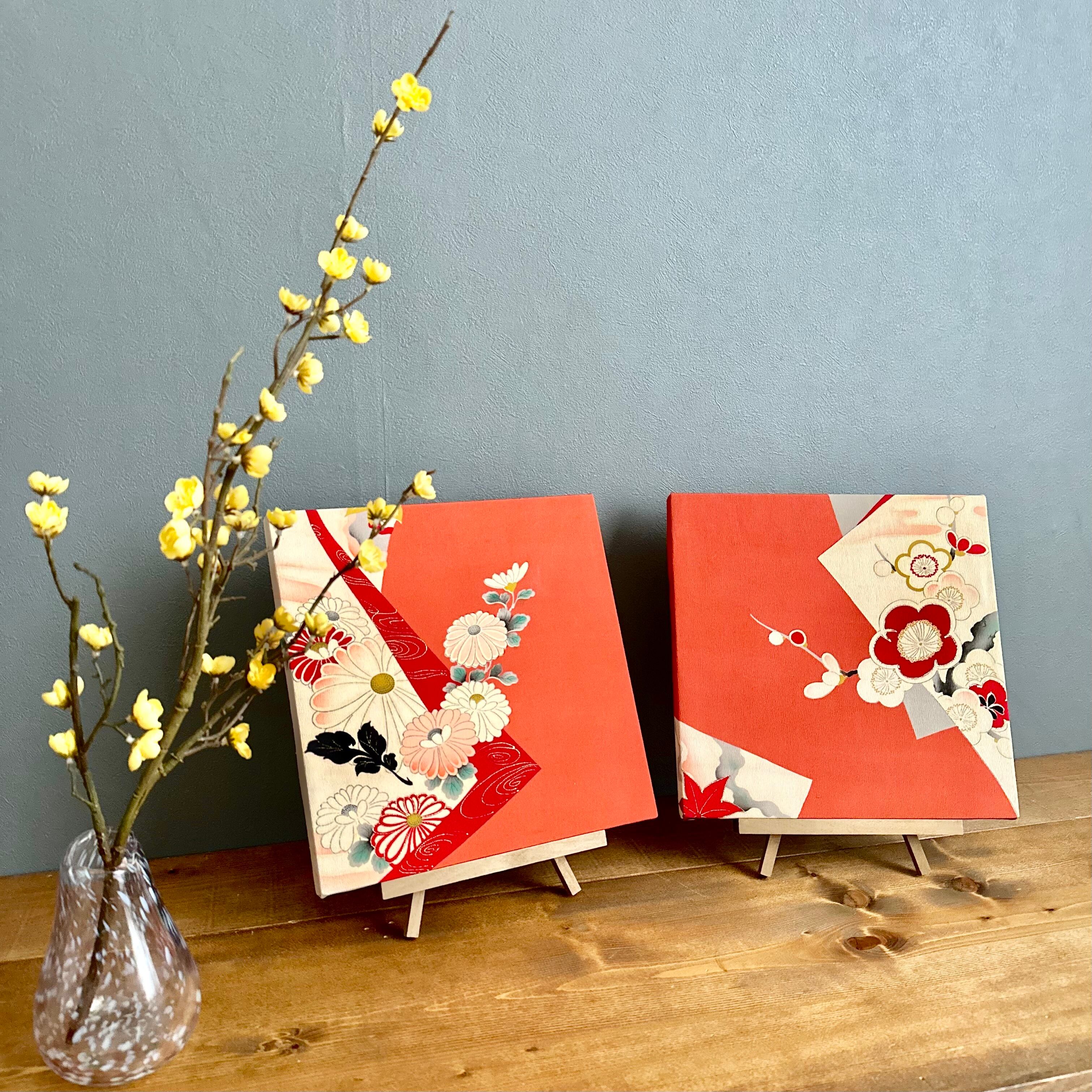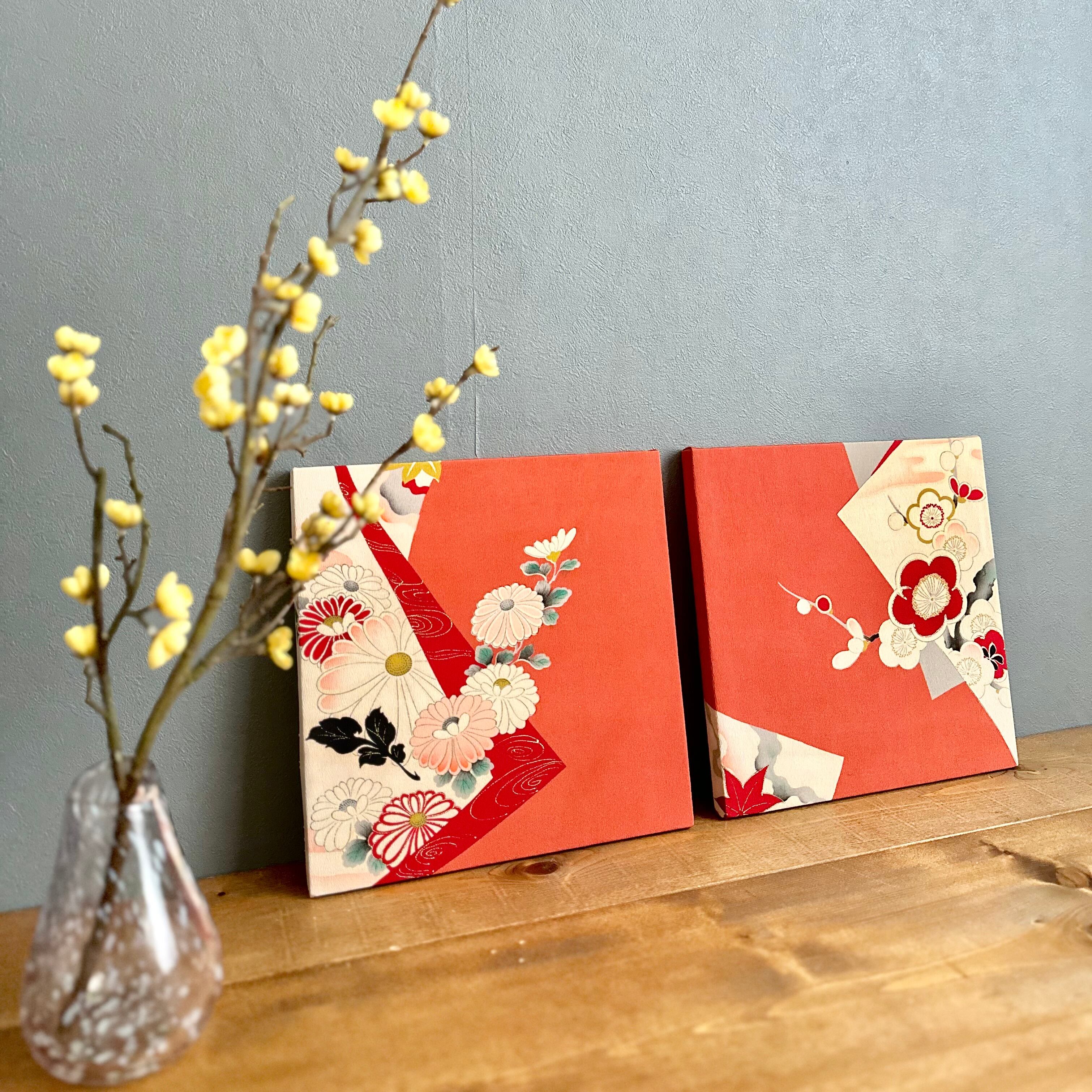 Kimono fabric panel 27×27cm 着物のファブリックパネル アンティーク 梅と菊(2枚組) Japanese Kimono Interior Japanese Style Art Panels Kimono panel Washitsu Japanese interior