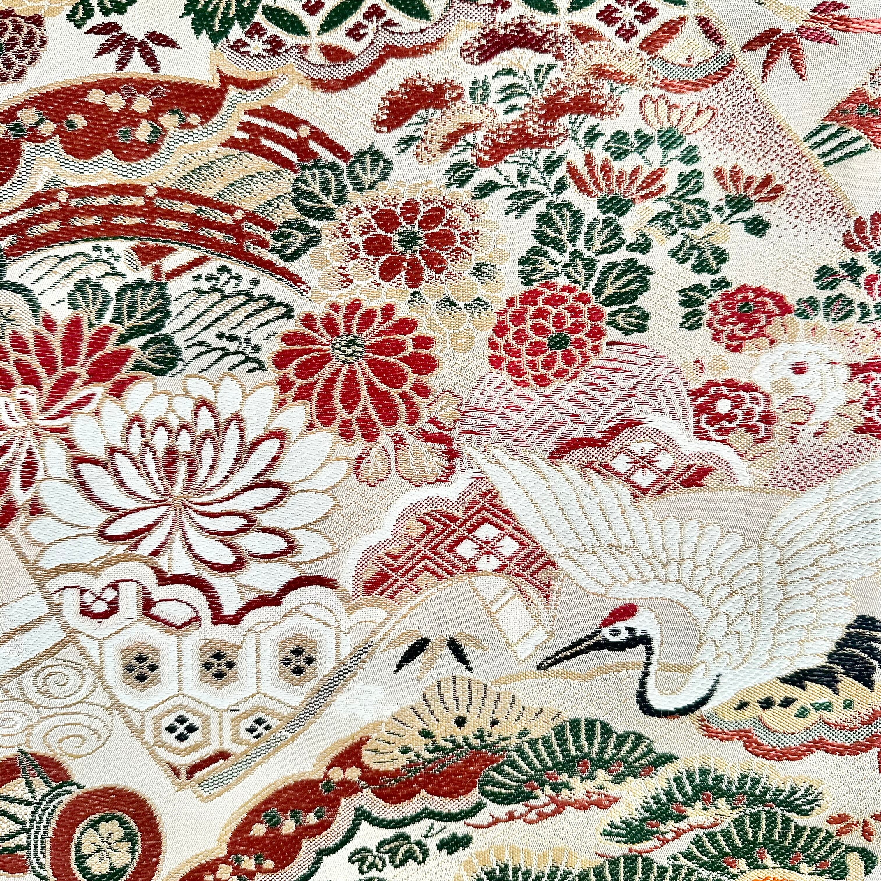 花の扇と鶴 ーCranes and the Floral Fan Blossom | Antiques Obi Tapestry Japanese Interior Art (130cm)