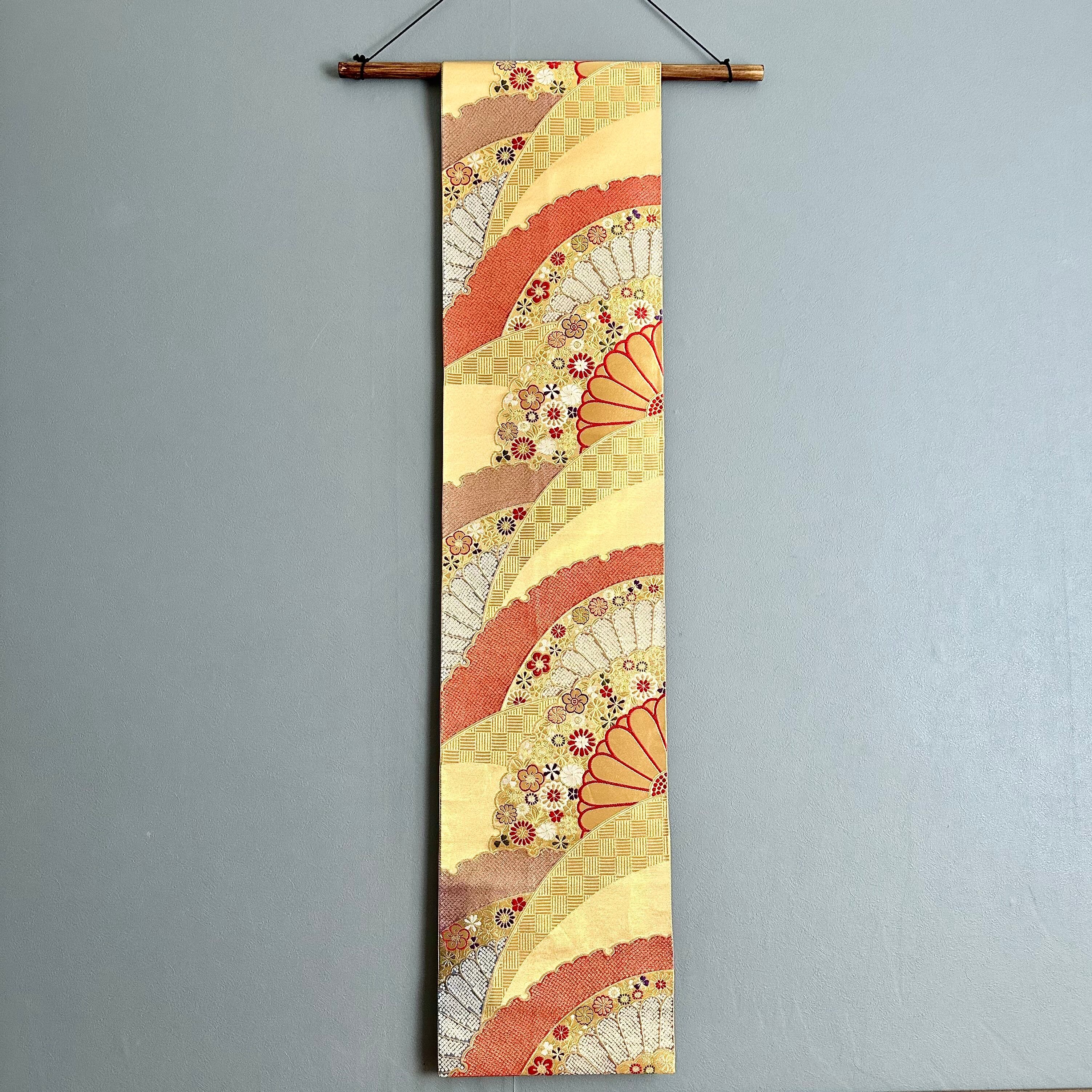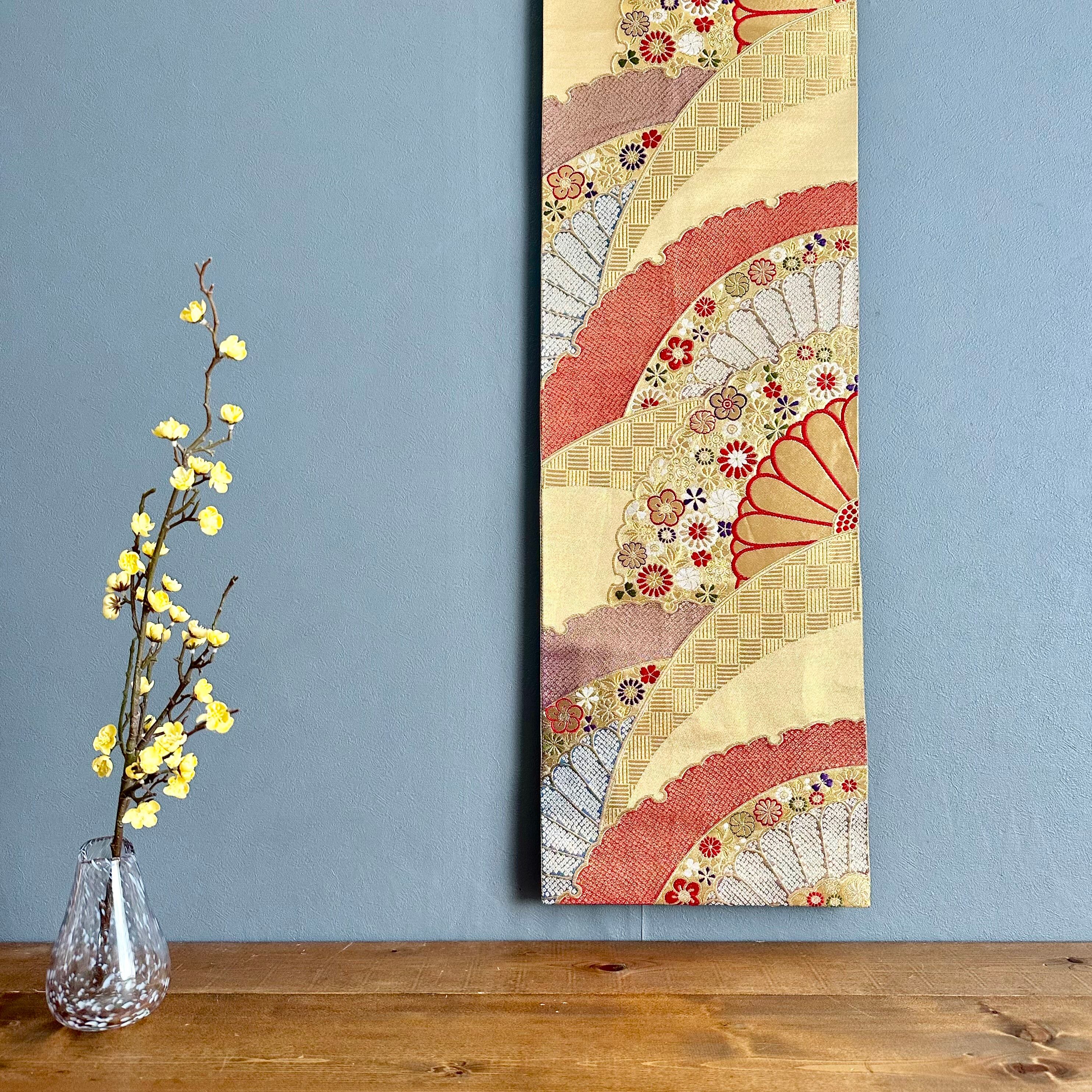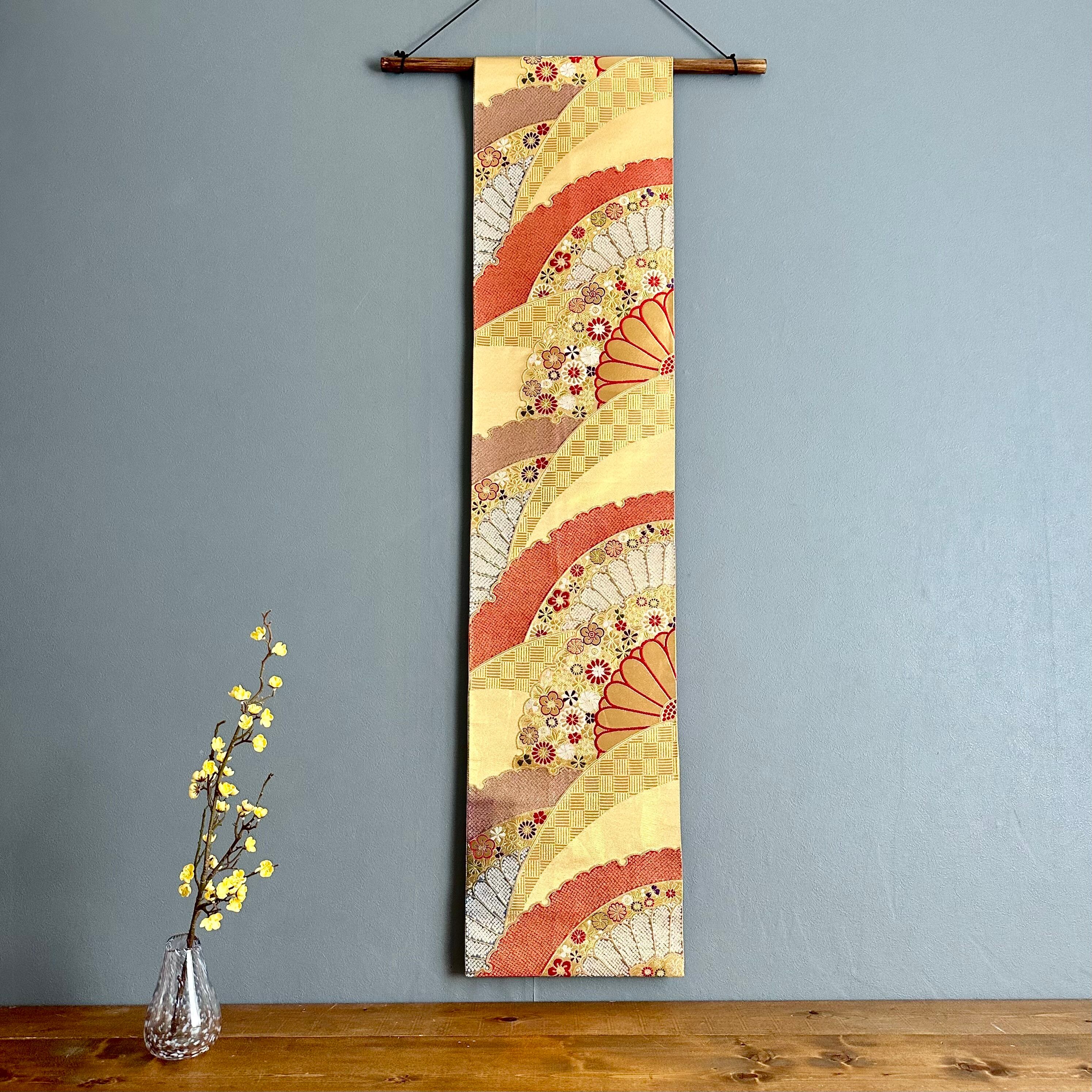 Kimono tapestry 帯のタペストリー ヴィンテージ 金色の扇 Japanese Kimono Interior Art Panel Kakejiku Art Wall Art Kimono Panel | koto1946