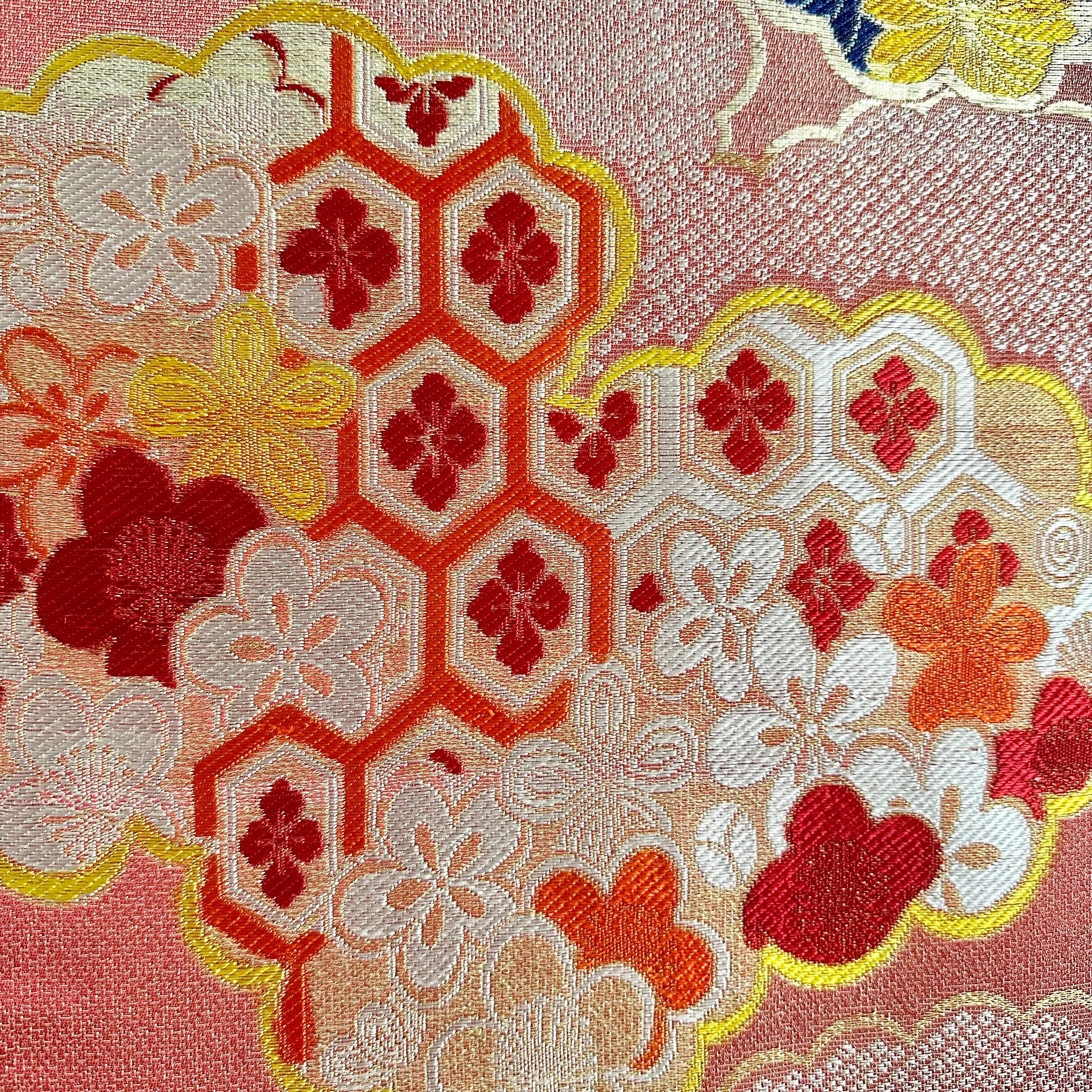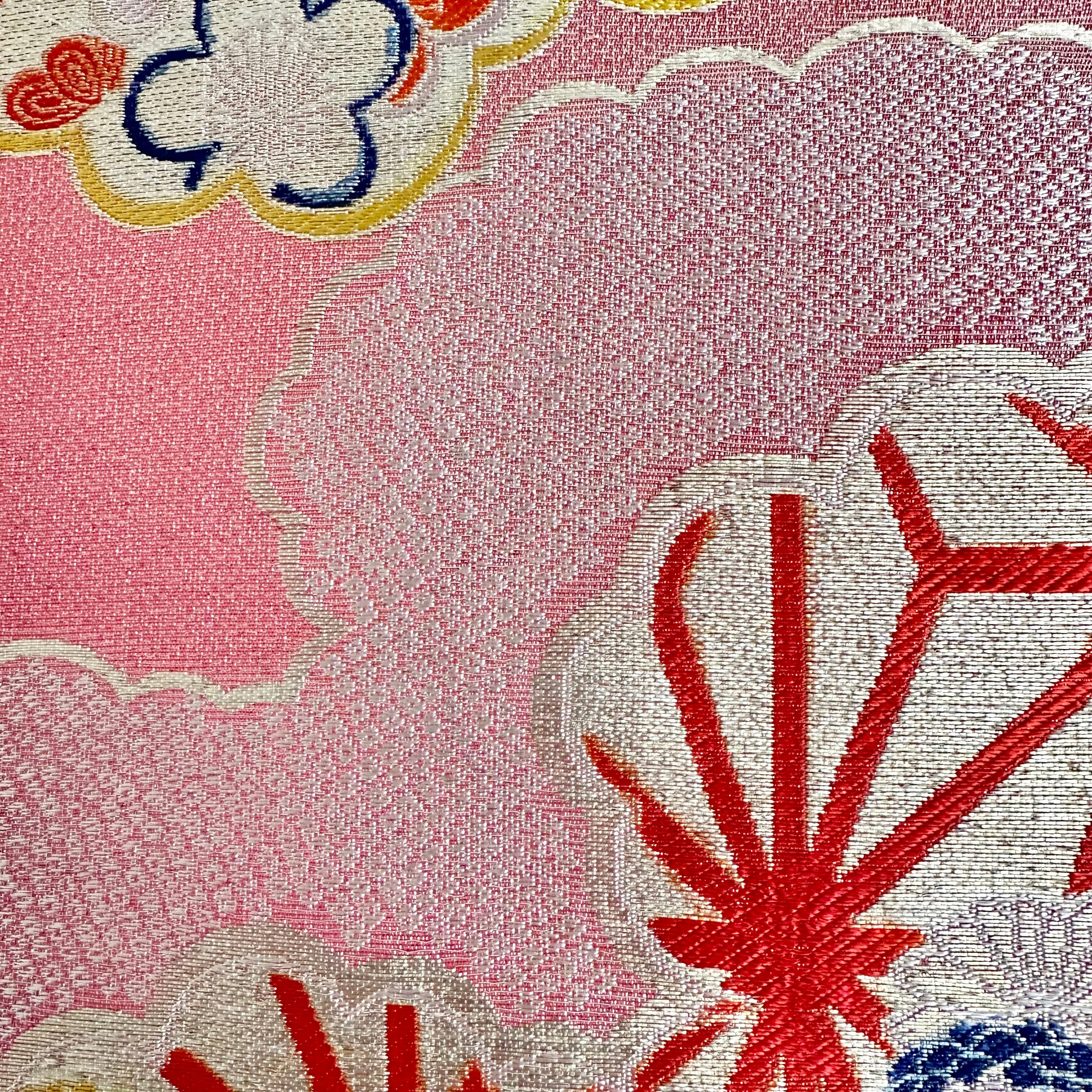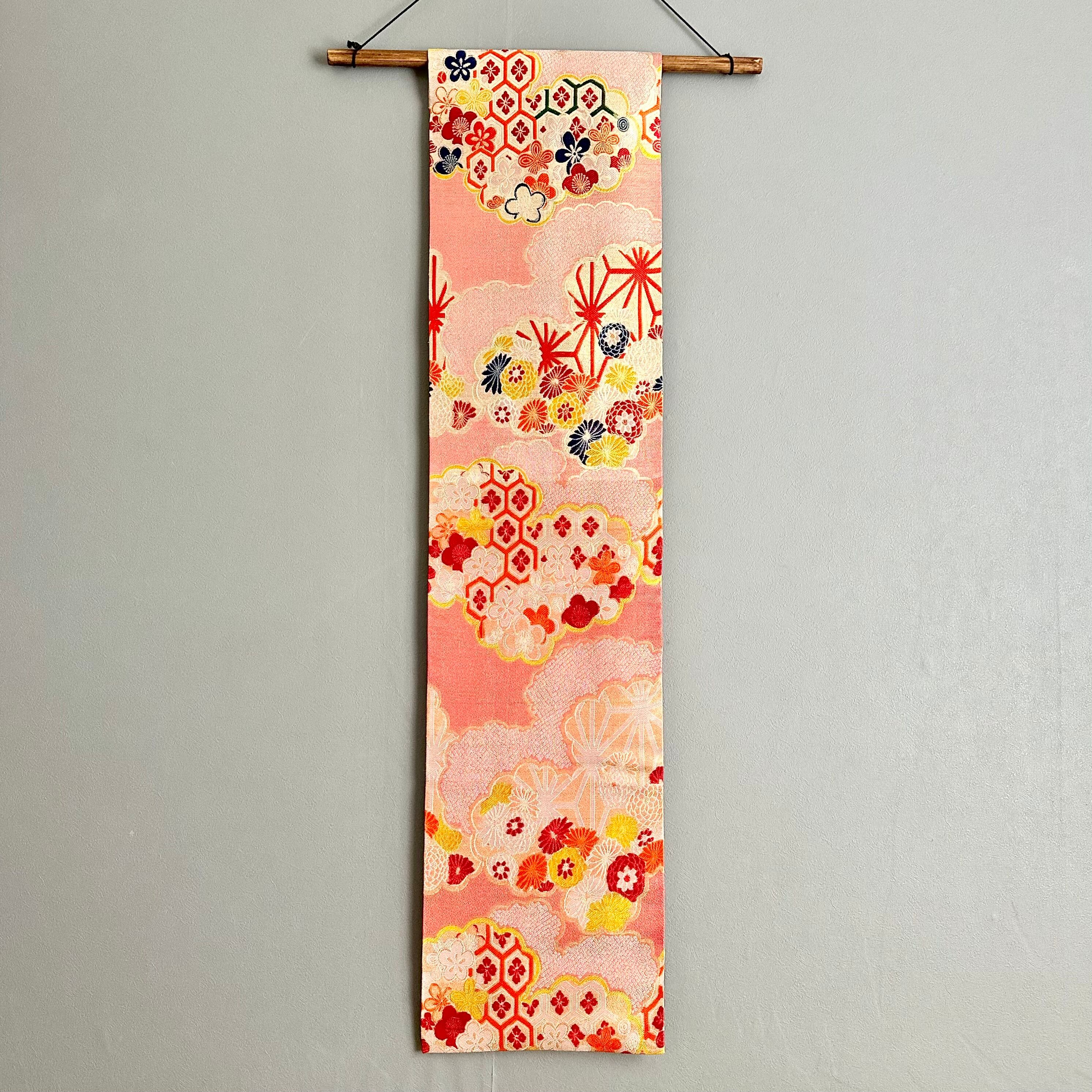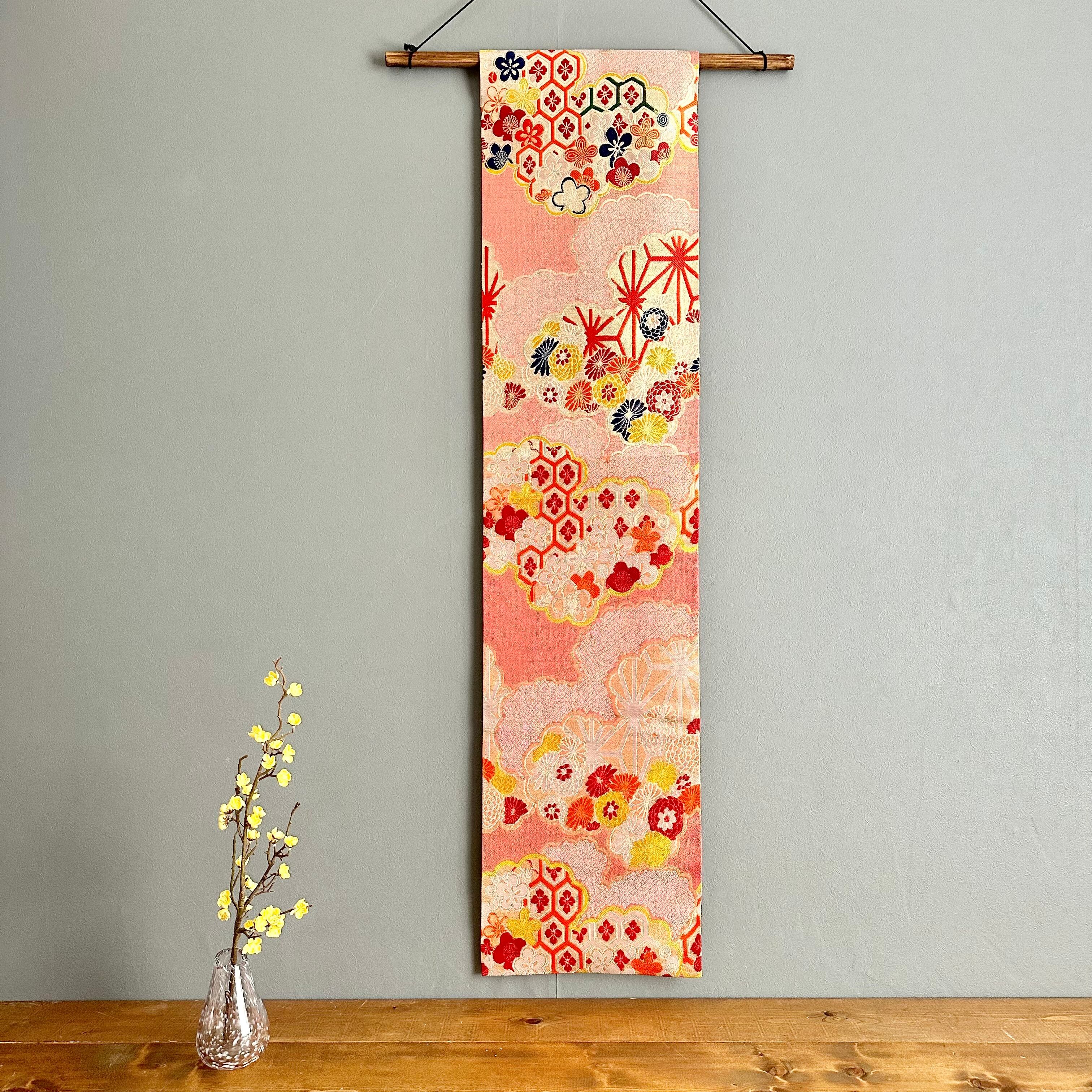 Kimono tapestry 帯のタペストリー アンティーク 赤に雲 Japanese Kimono Interior Art Panel Kakejiku Art Wall Art Kimono Panel | koto1946