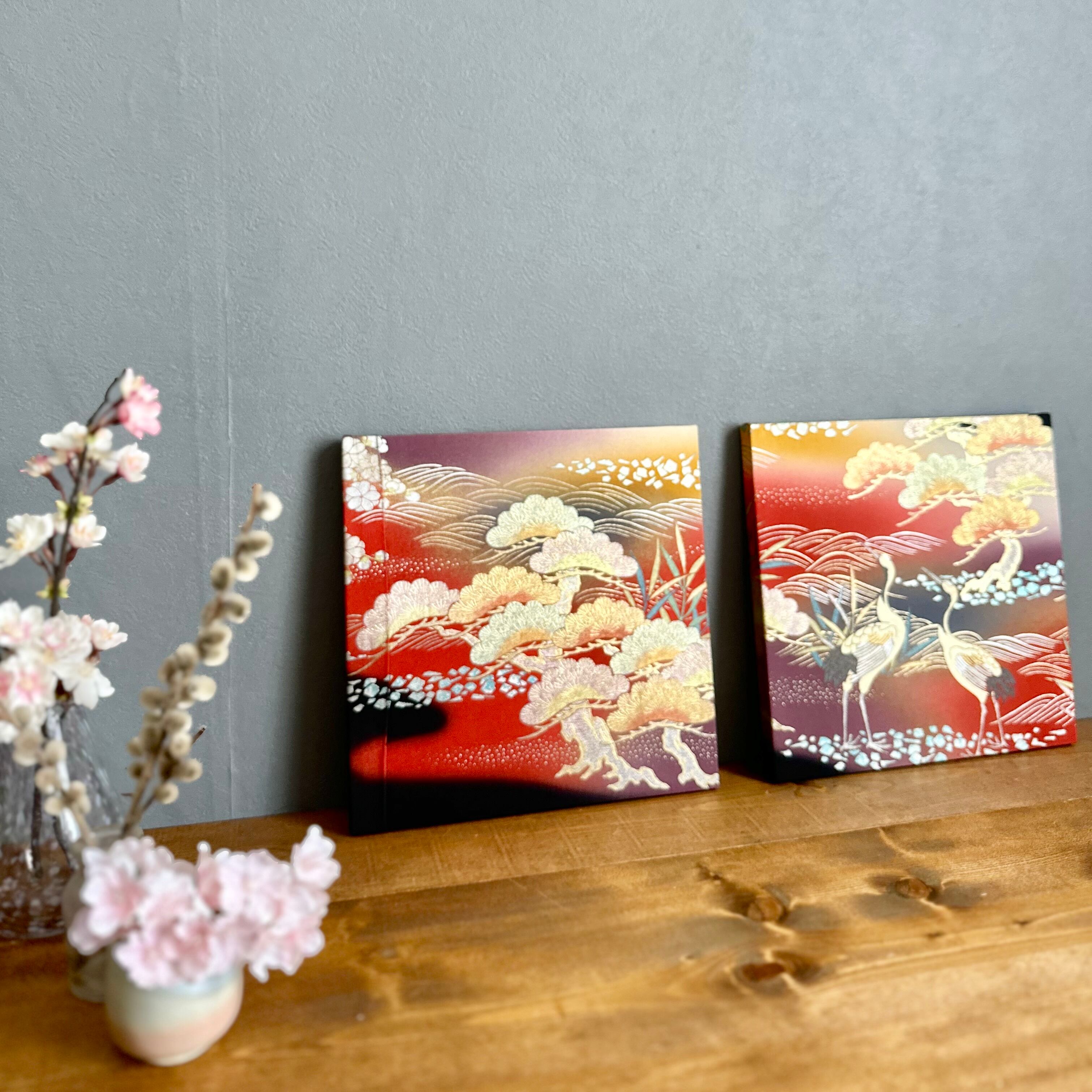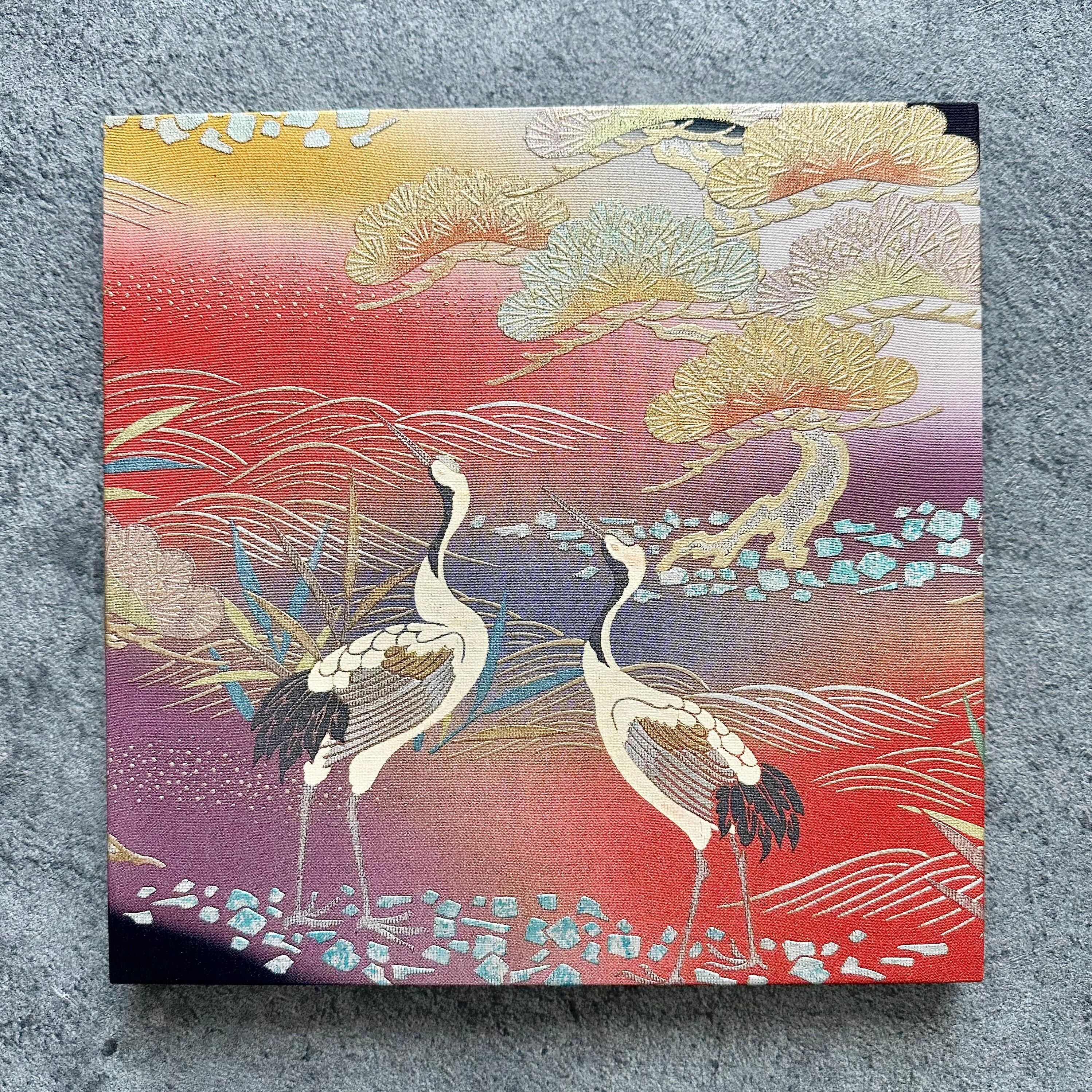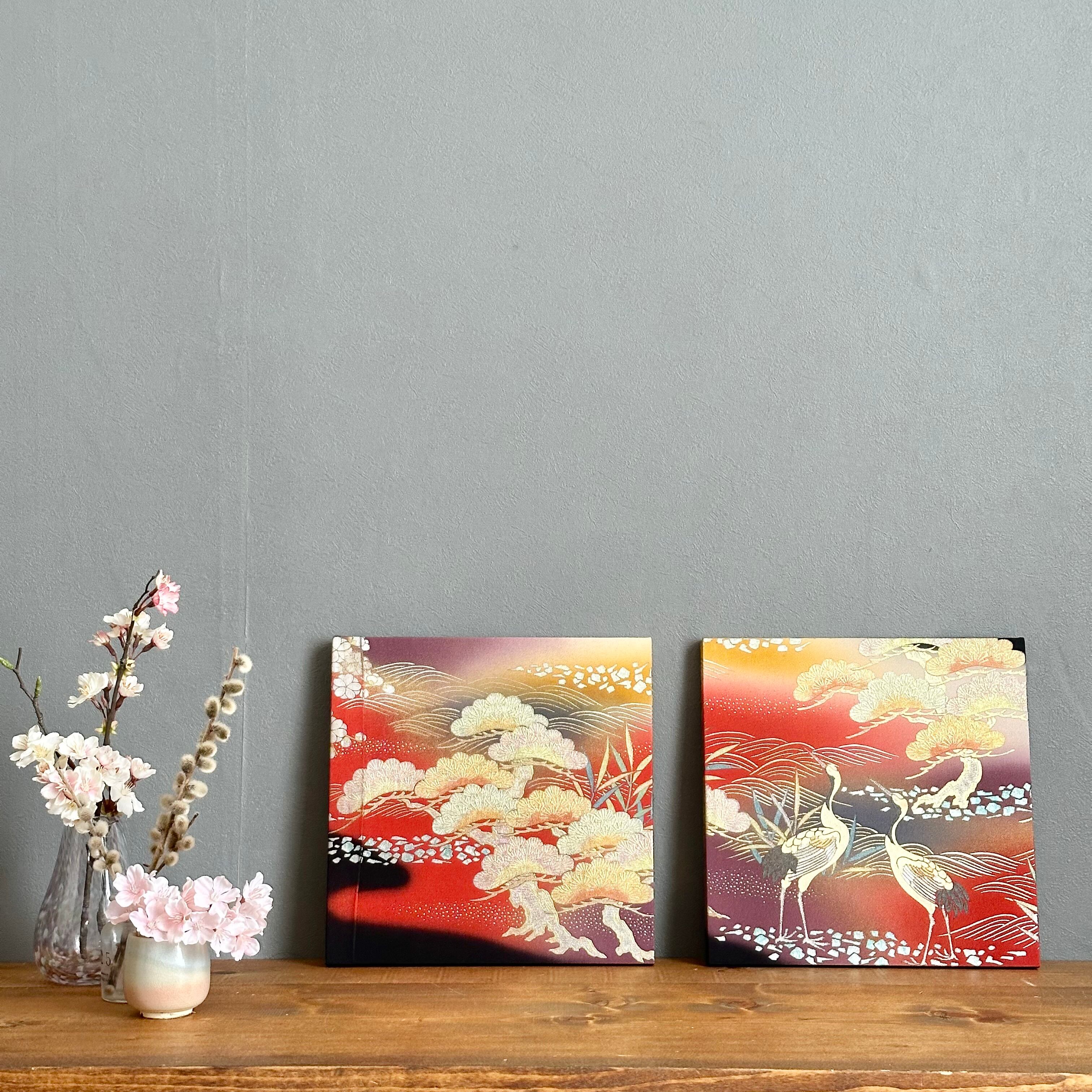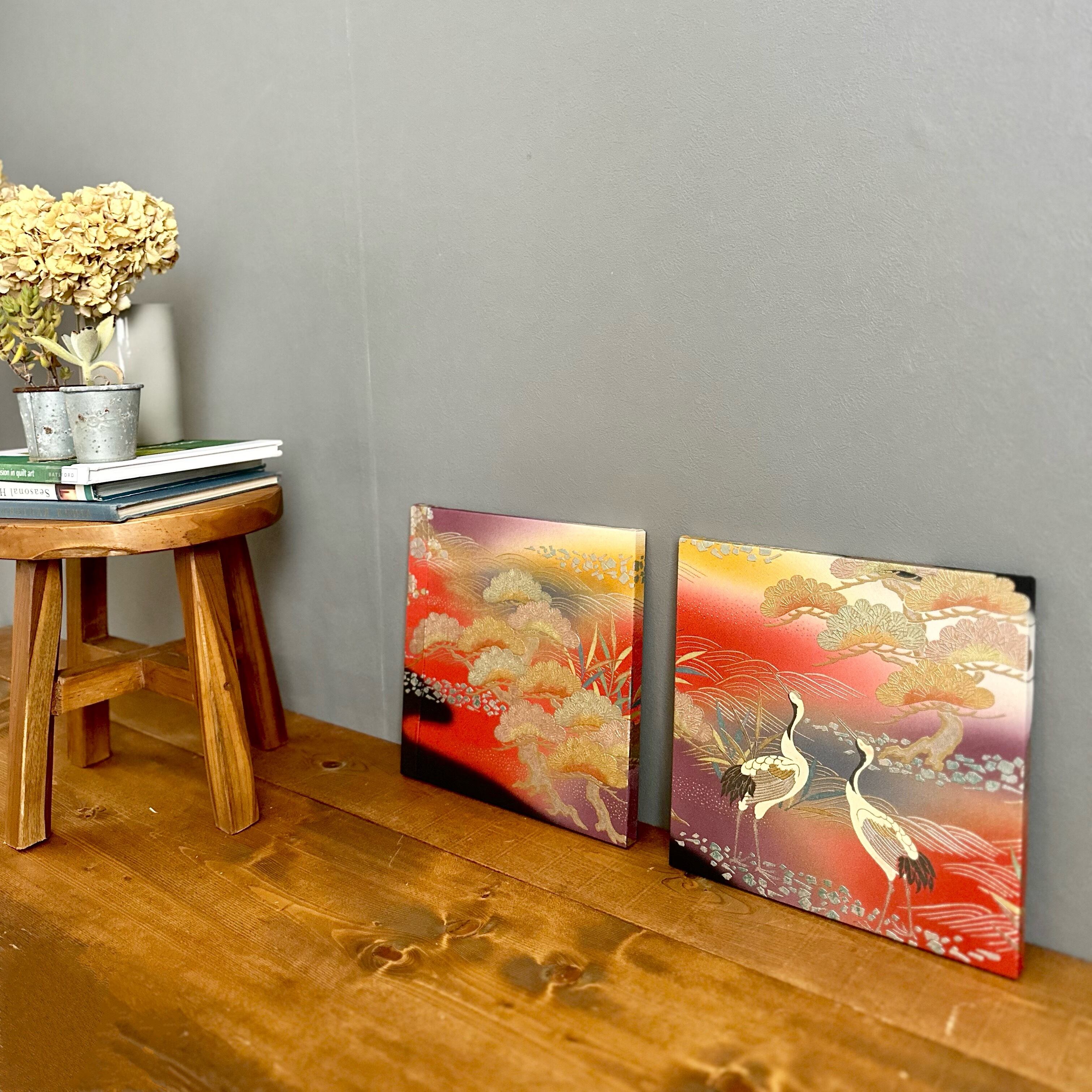 Vintage Kimono Fabric Panel ヴィンテージ着物 ファブリックパネル 朝焼けに鶴27×27cm(2枚組) Japanese Wall Art