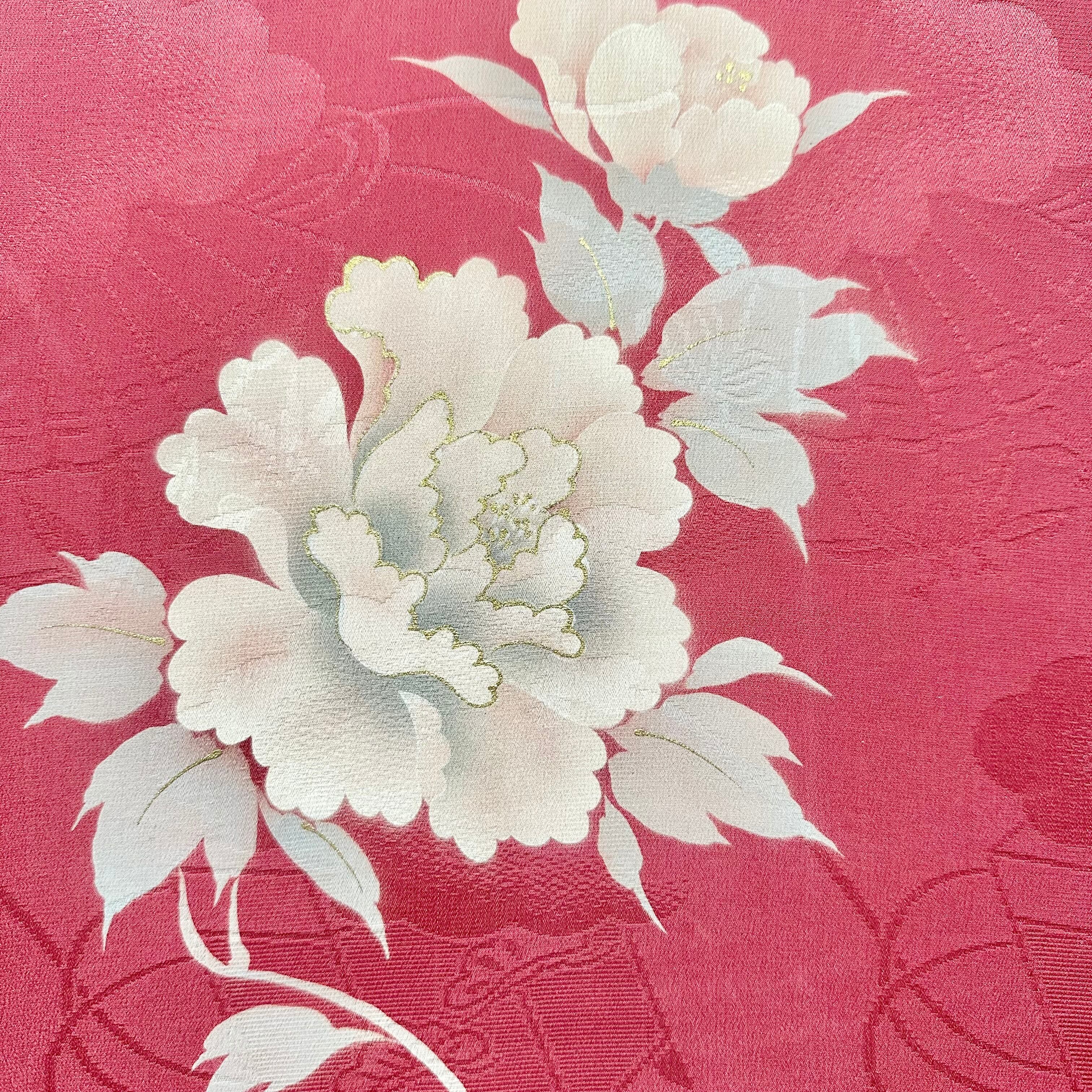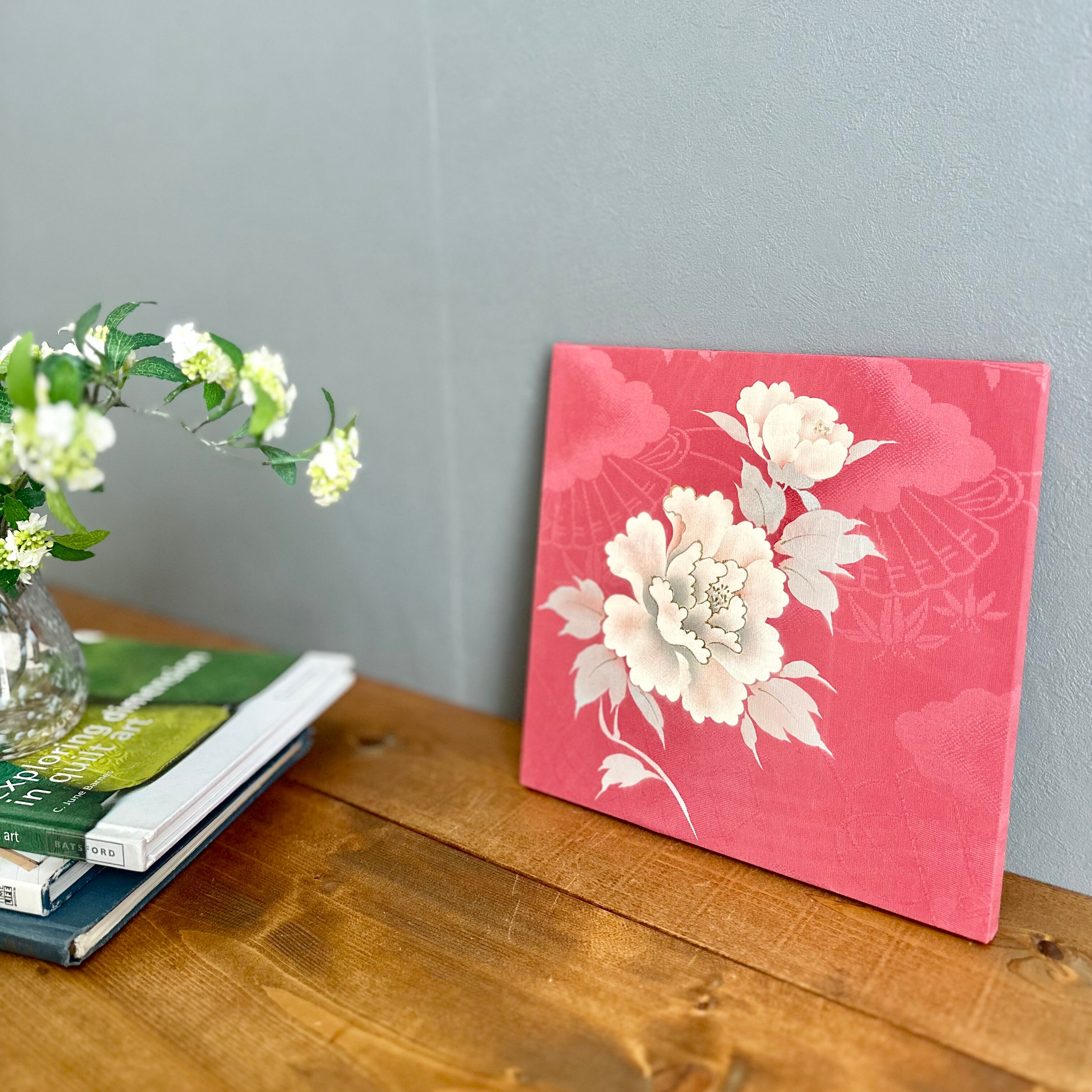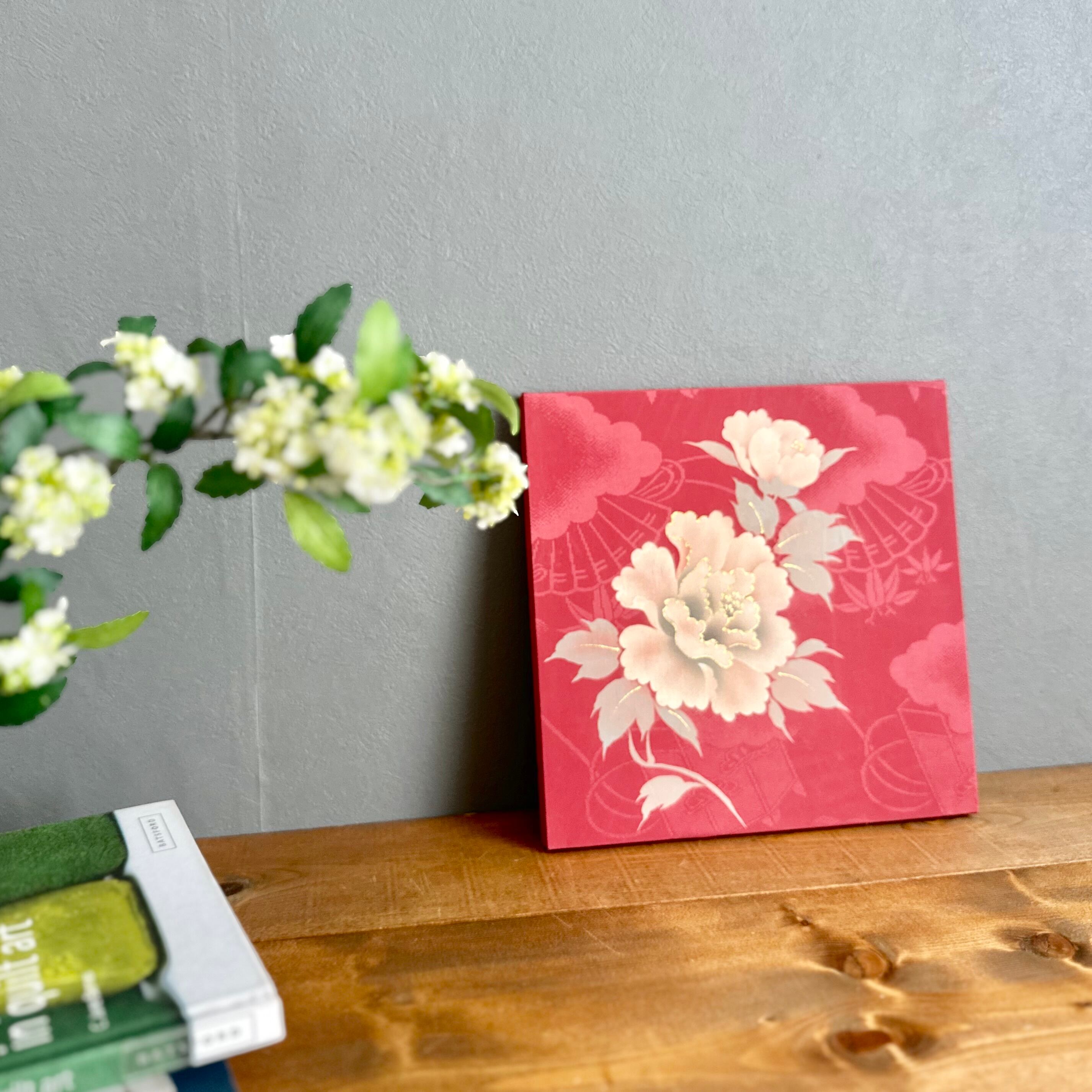 ヴィンテージの牡丹柄のお着物から仕立てた一点もののファブリックパネルです。