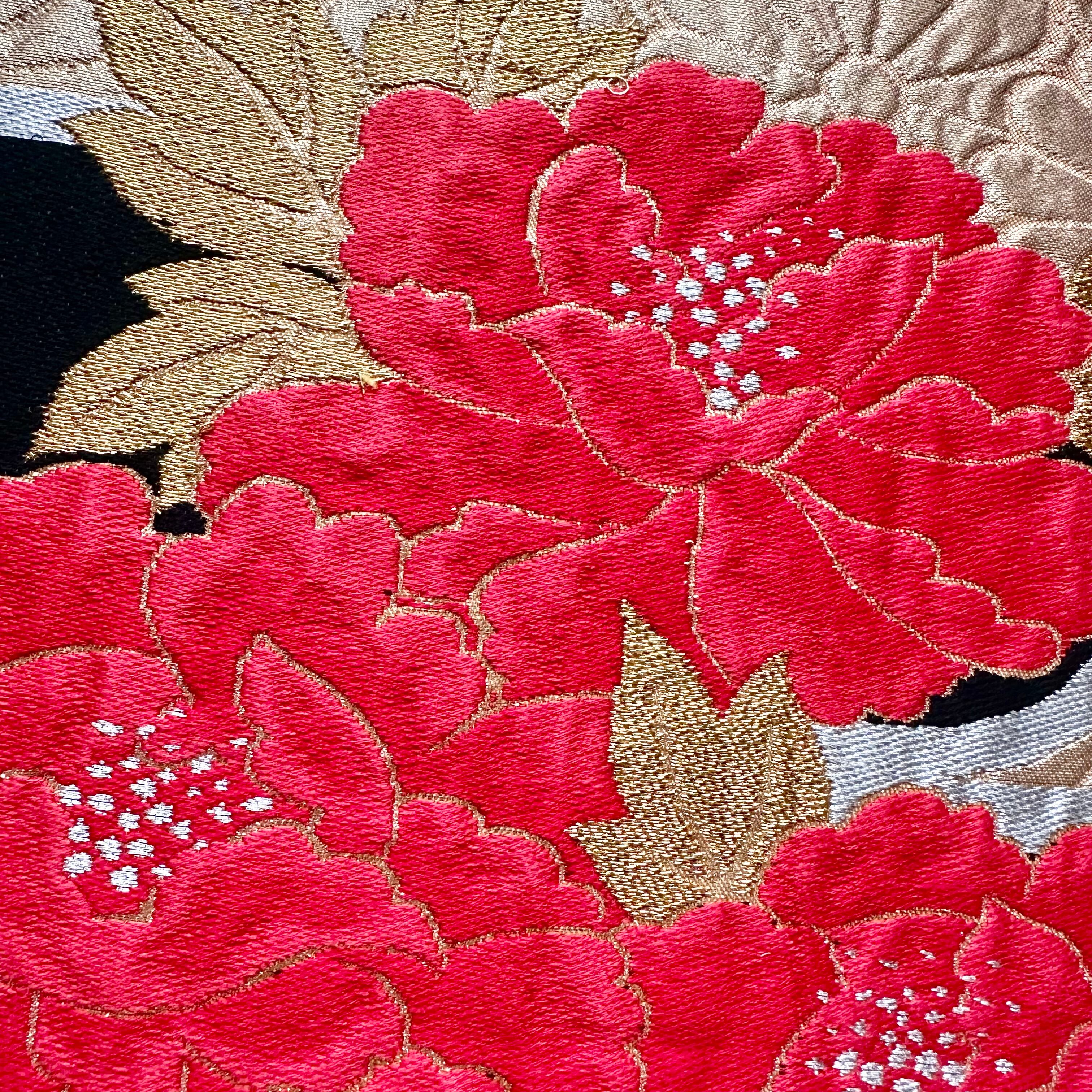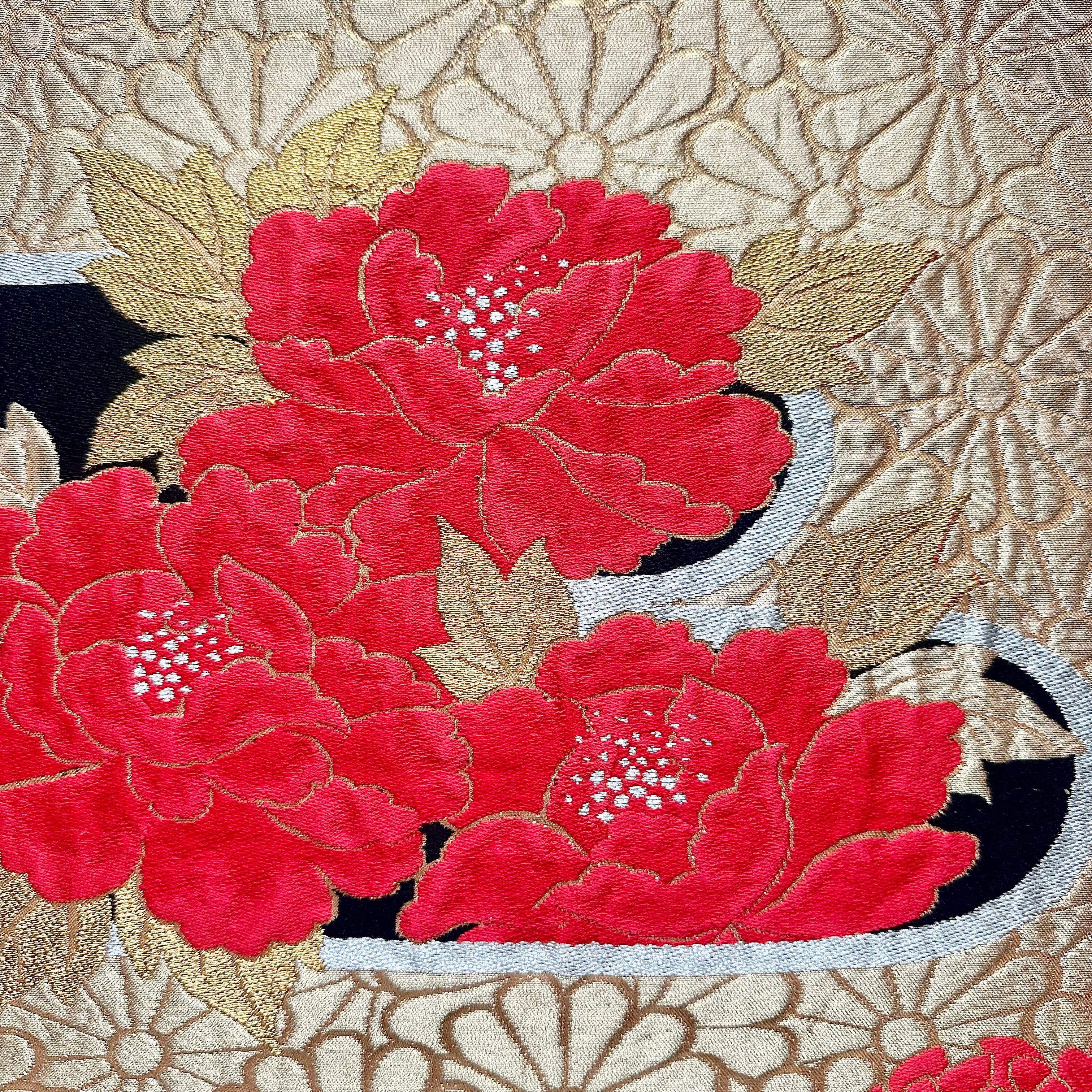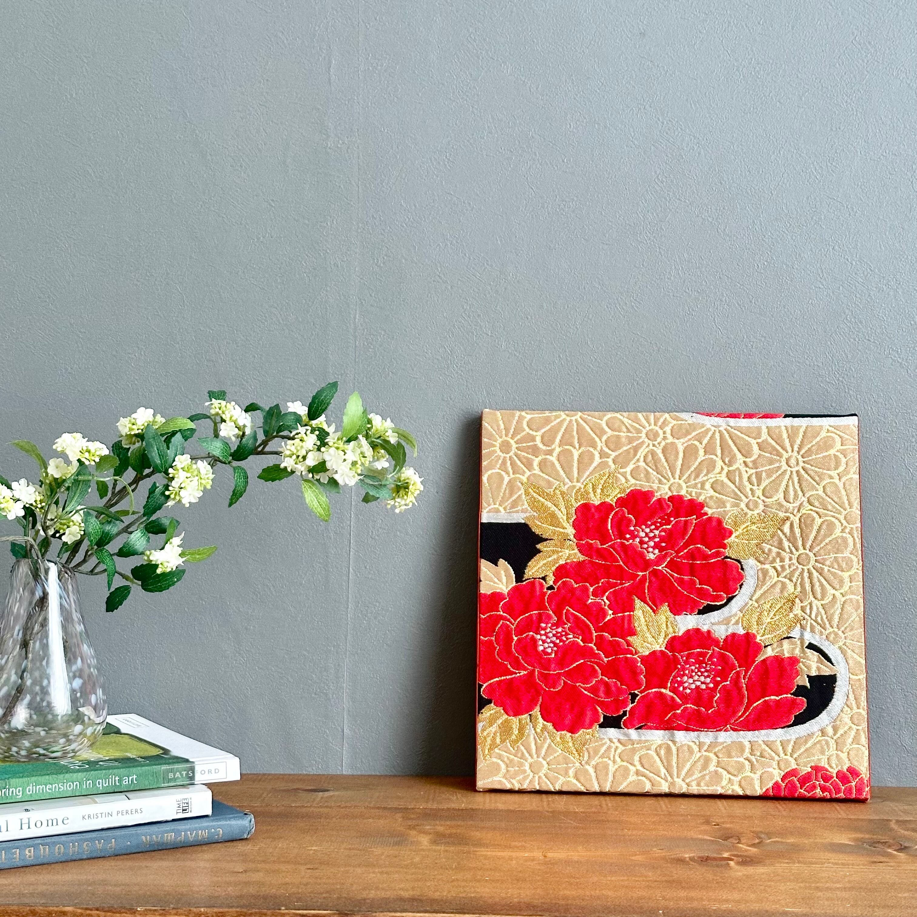 ヴィンテージの牡丹柄の帯から仕立てた一点もののファブリックパネルです。