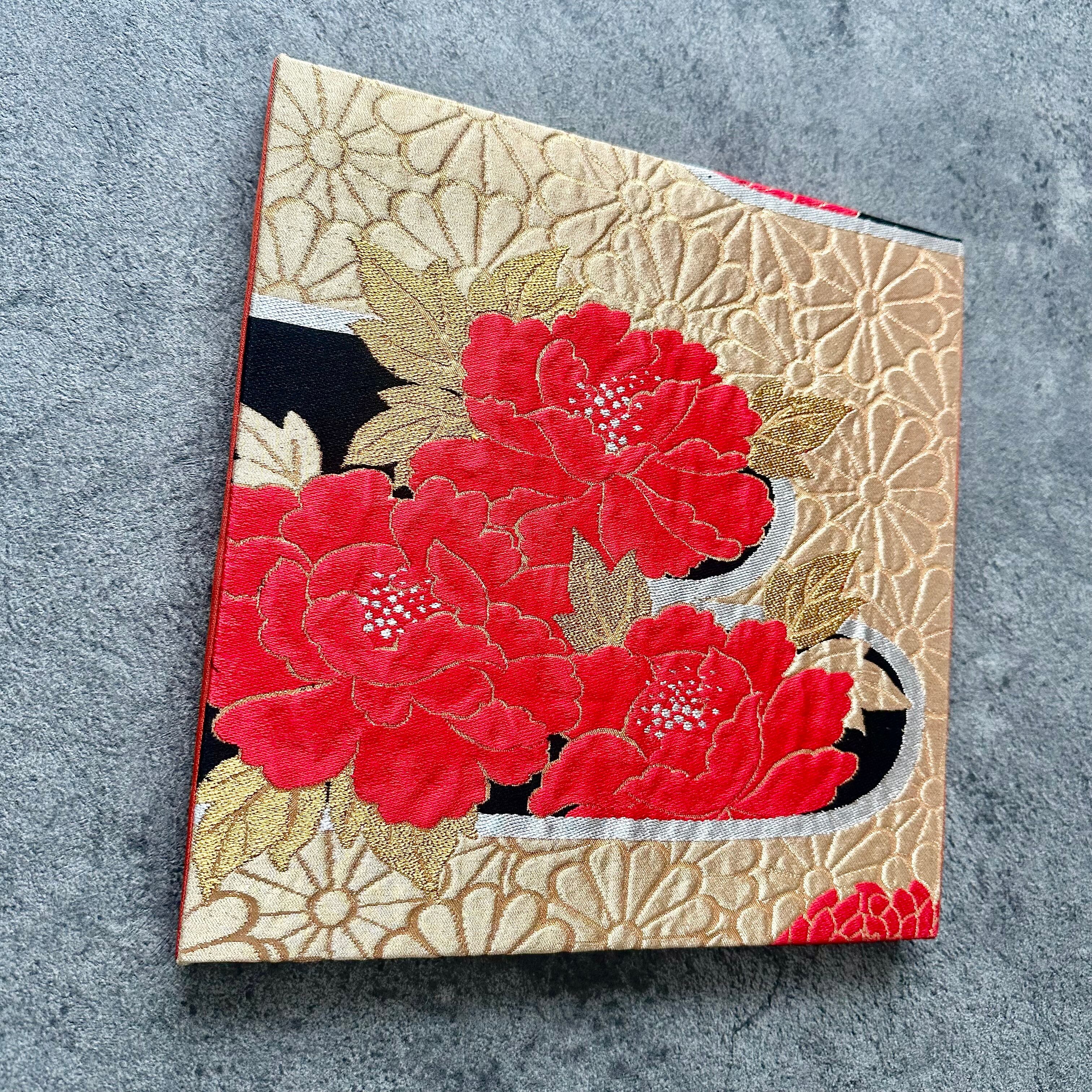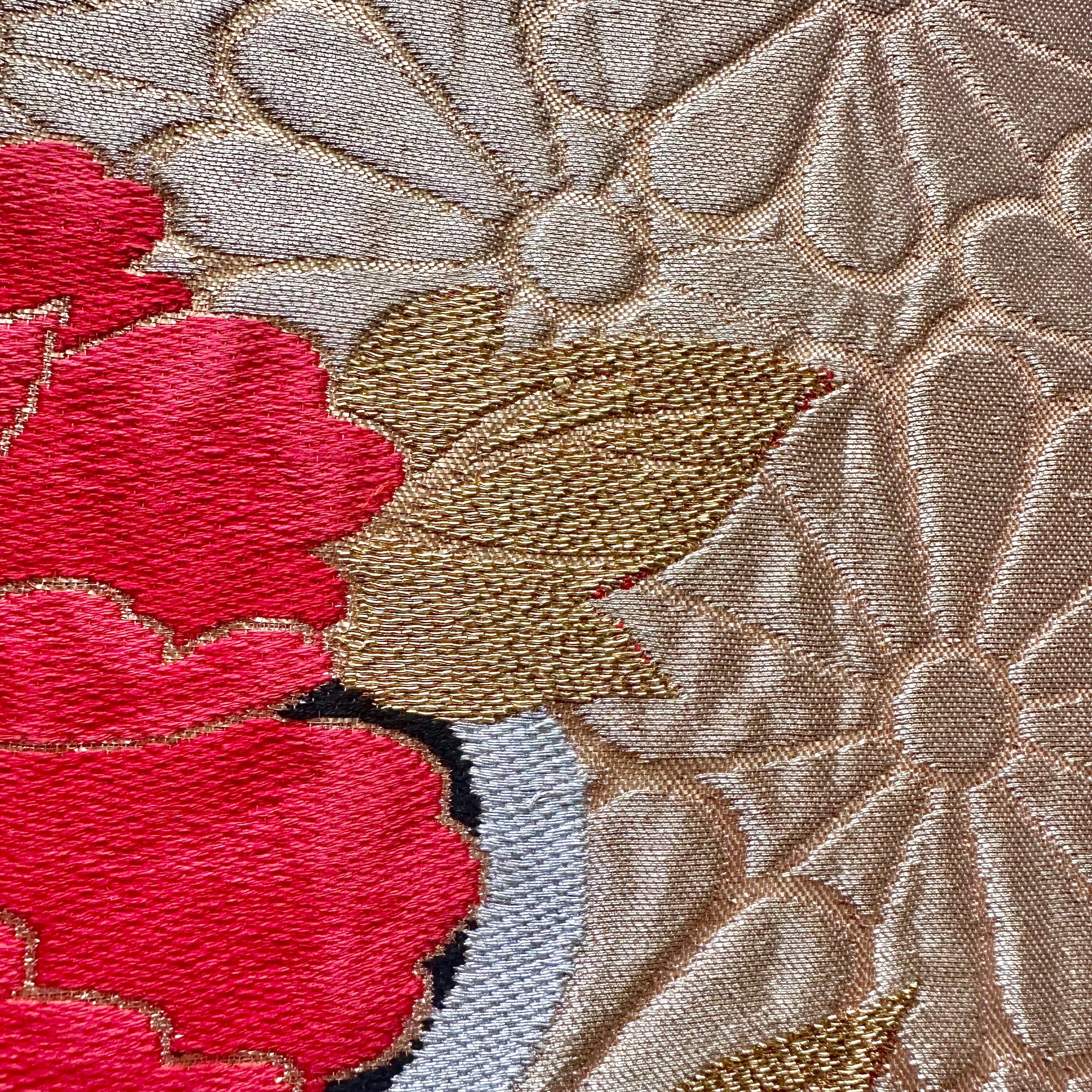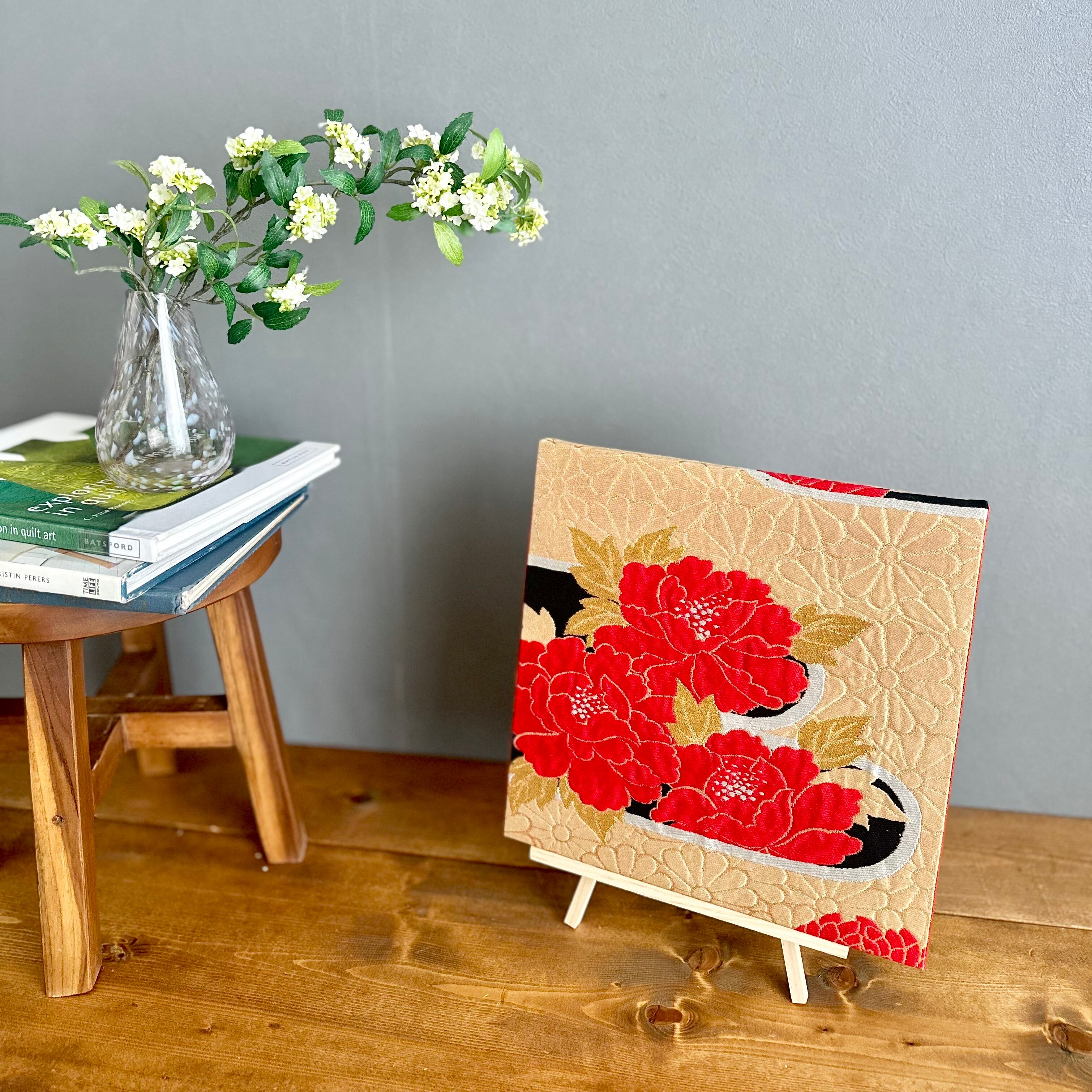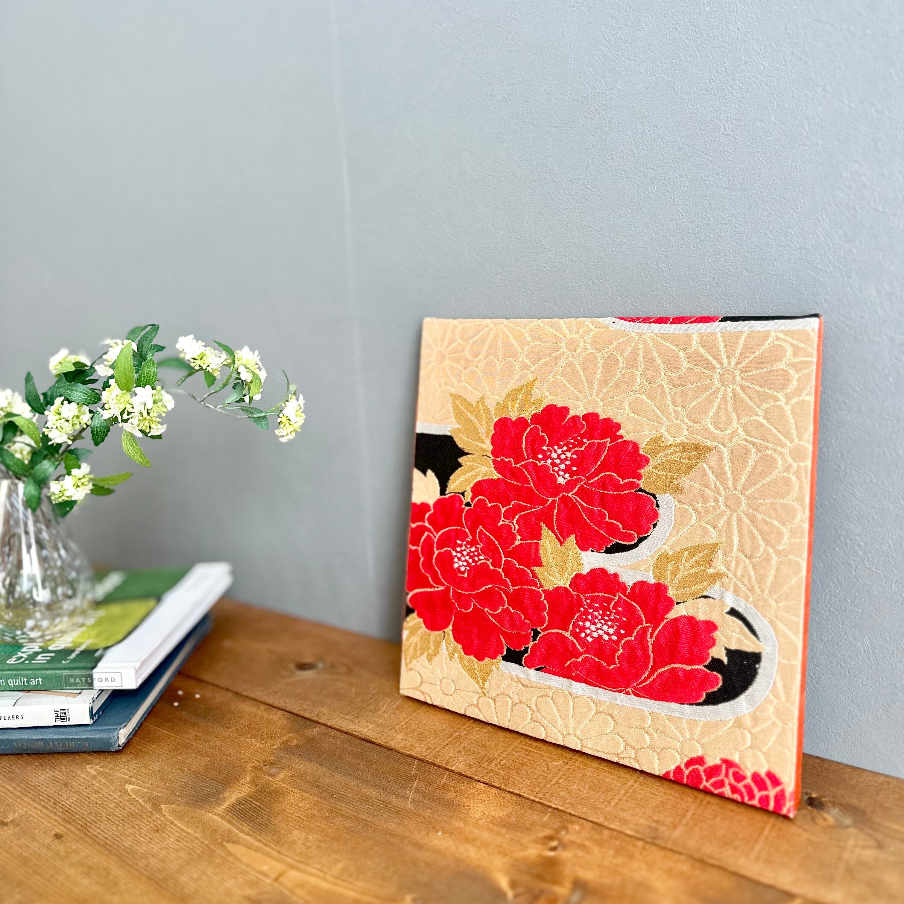 ヴィンテージの牡丹柄の帯から仕立てた一点もののファブリックパネルです。