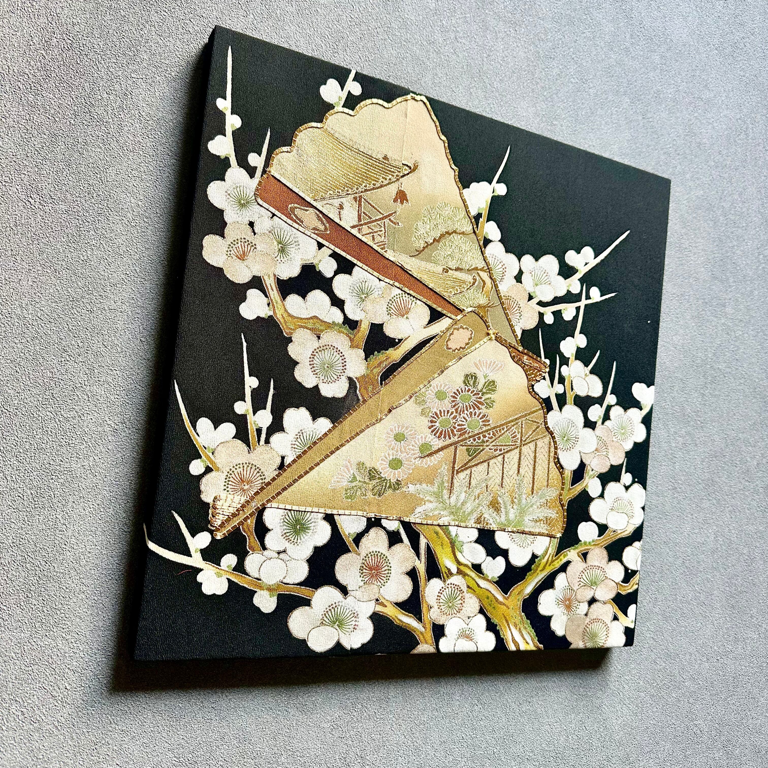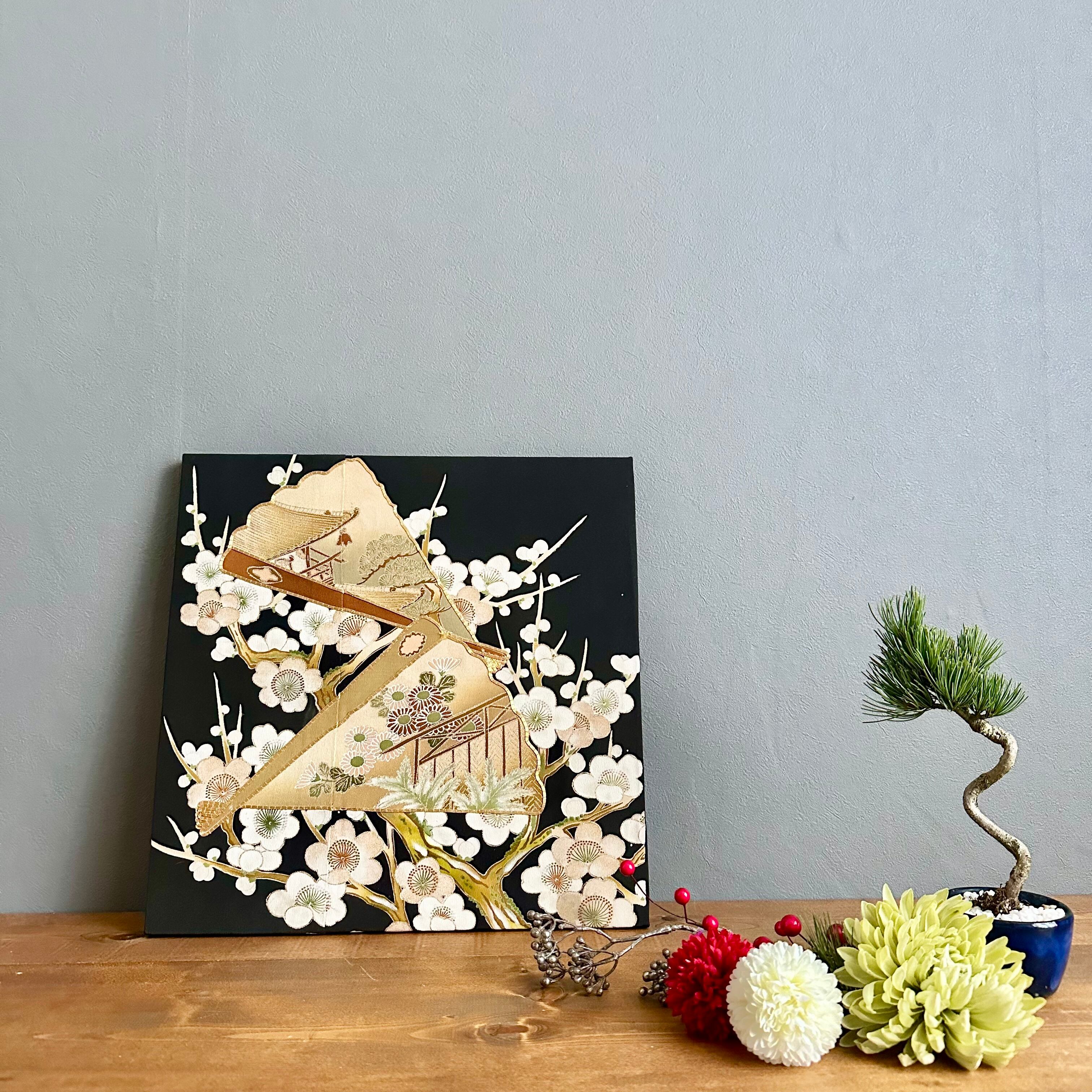 Kimono fabric panel ※38×38cm 大きな着物のファブリックパネル 漆黒に咲く梅と扇 Japanese Kimono Interior Japanese Style Art Panels Kimono panel Washitsu Japanese interior | koto1946