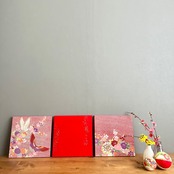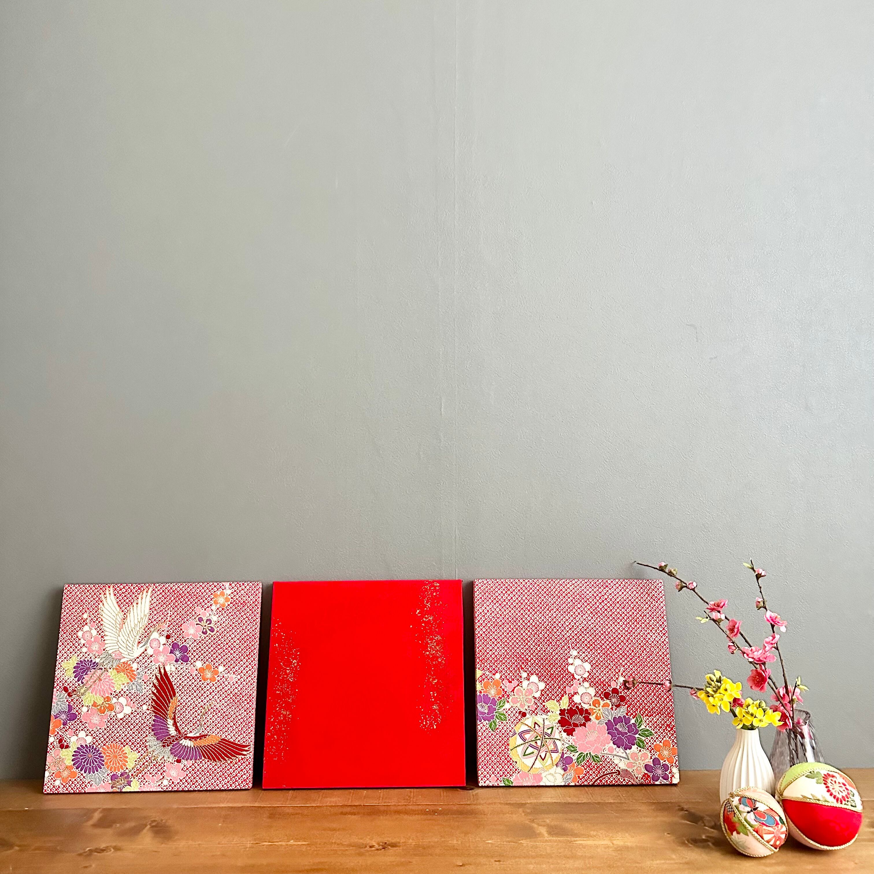 Kimono fabric panel 30×30cm 着物のファブリックパネル ハレの日 鶴と毱×赤(3枚セット)Japanese Kimono Interior Japanese Style Art Panels Kimono panel Washitsu Japanese interior | koto1946