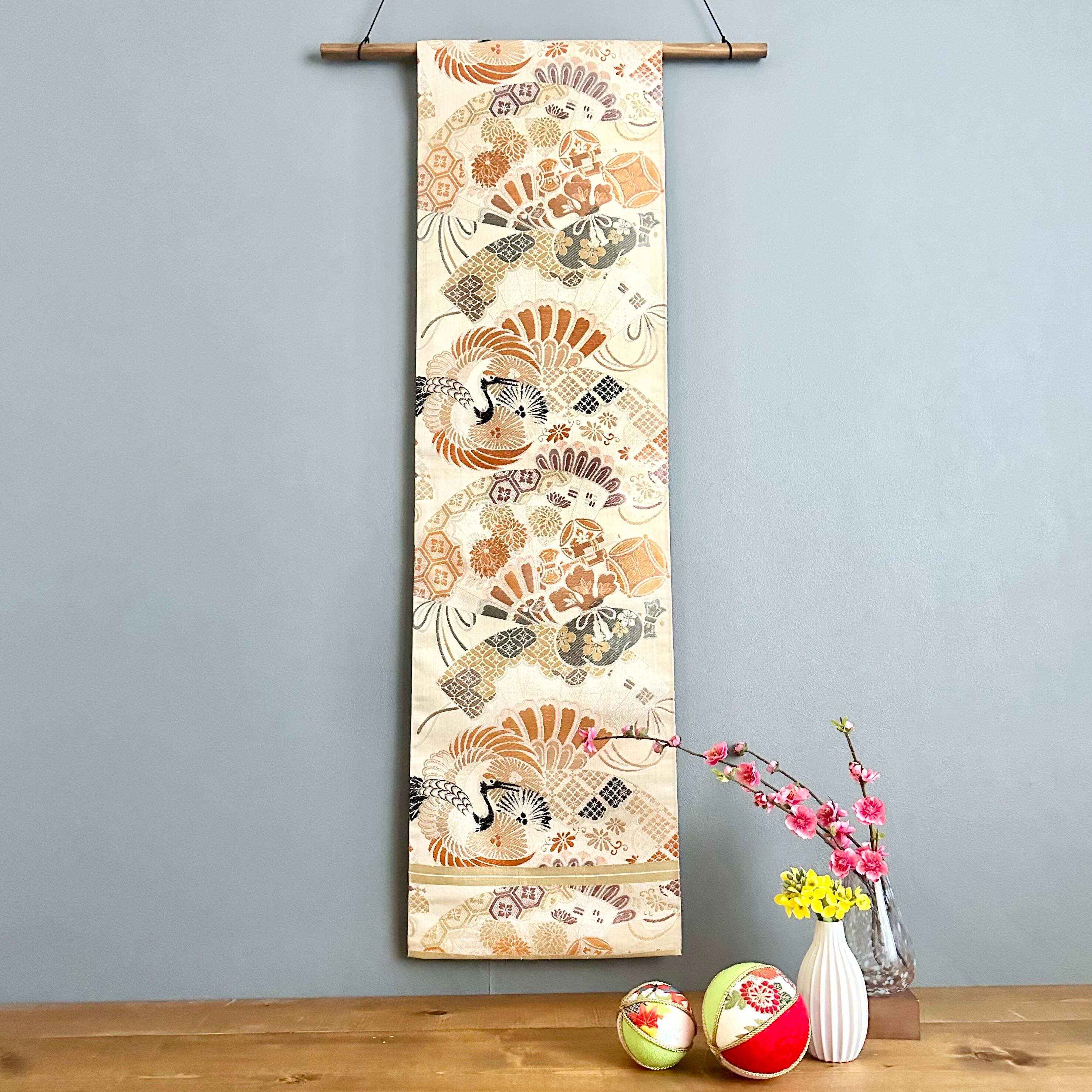 Kimono tapestry 帯のタペストリー アンティーク 花の扇と鶴 Japanese Kimono Interior Art Panel Kakejiku Art Wall Art Kimono Panel | koto1946